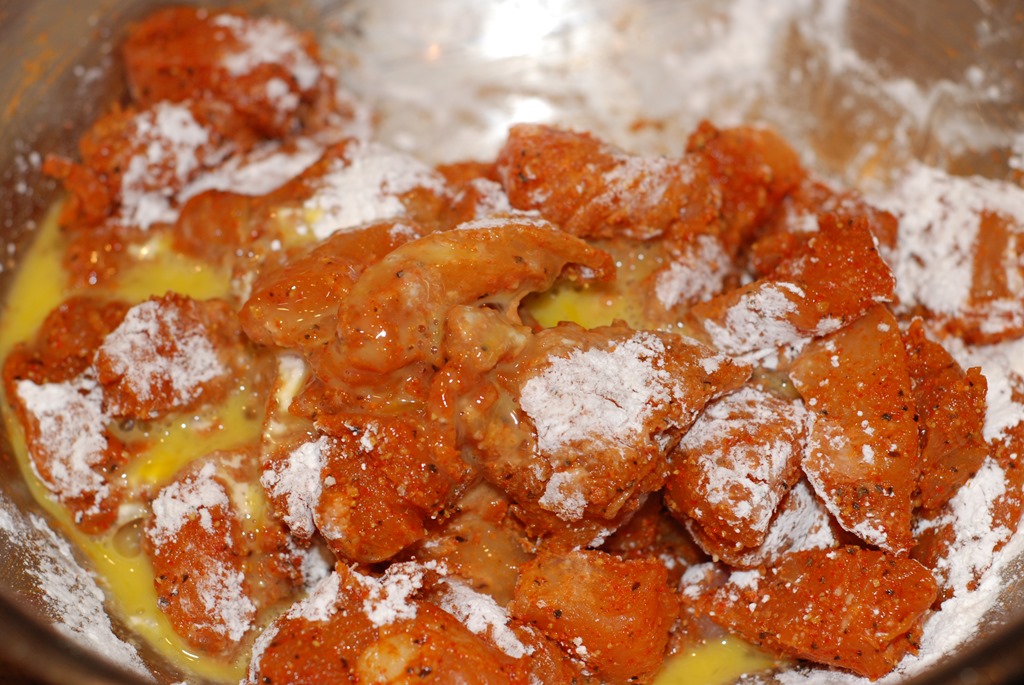2. Add half of one beaten egg, corn starch, all purpose flour and a pinch of salt to the marinated chicken. Mix well.
