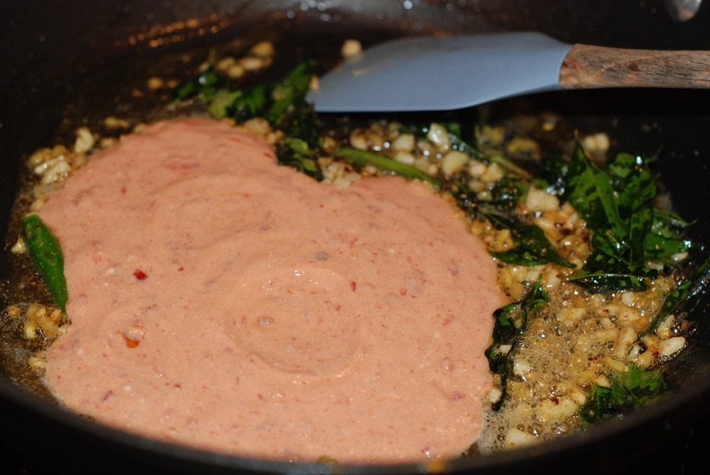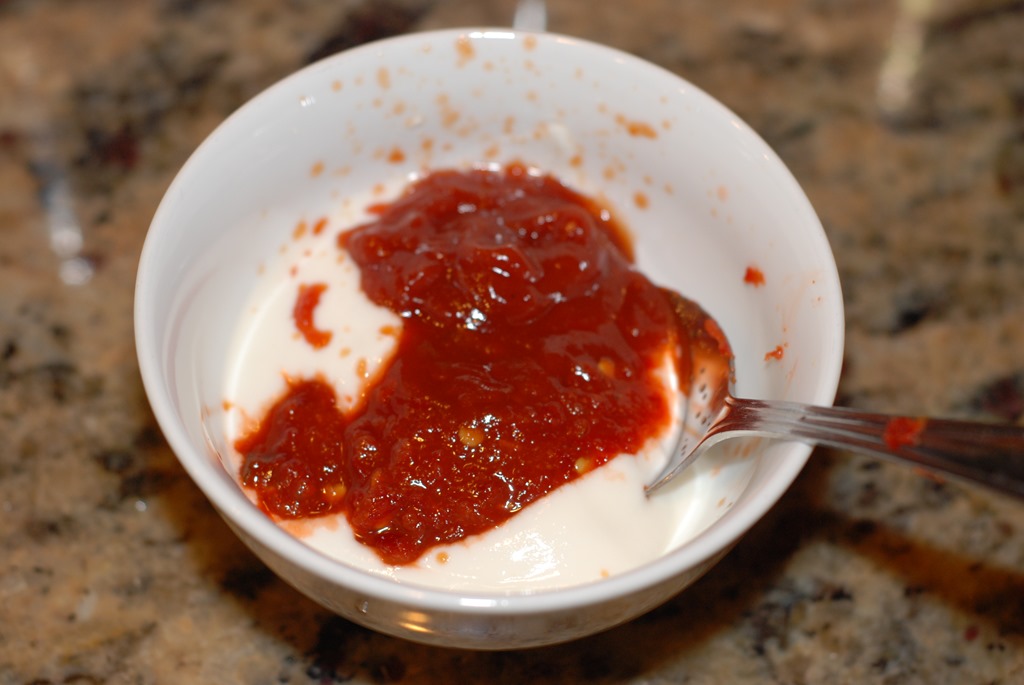 4. Combine the beaten yoghurt with tomato ketchup and chilly garlic sauce.