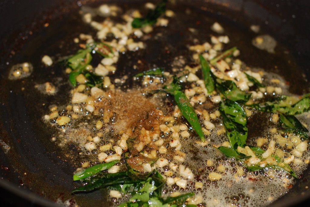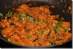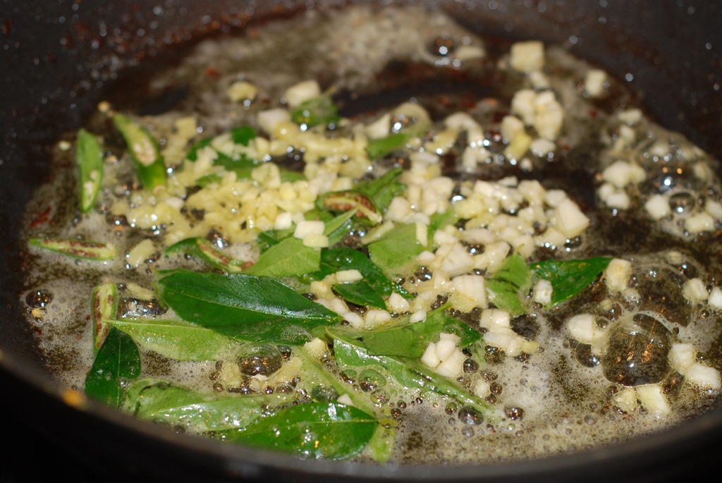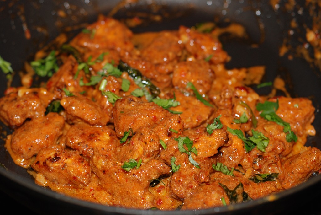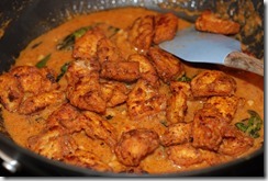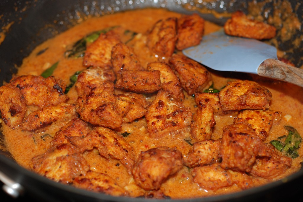 5. Heat 2 tbsp oil + butter in a pan over medium heat. Add ginger, garlic, green chilies and curry leaves. Cook for 1 minute. Bring down the heat to low. Add 1/4 – 1/2 tsp cumin powder and 1/2 tsp garam masala powder. Mix well. Add yoghurt mixture and mix well. Cook for a few minutes until oil separates. Taste-check for salt. Add 1/4 cup water, if it is very thick and mix well. Cook for a minute or two and add the fried chicken pieces. Stir until they are well-coated with the gravy. You can cook for a few more minutes until completely dry. Switch off. Sprinkle chopped cilantro and serve immediately with onion rings and lemon wedges. Enjoy!!