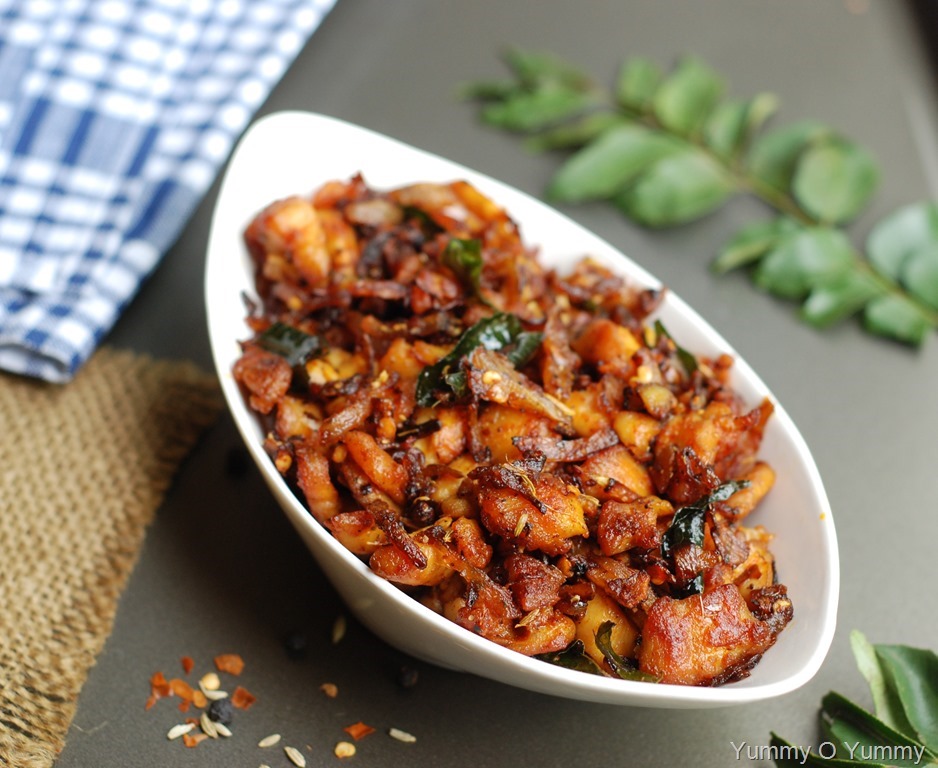 3. In the remaining oil, add onion, ginger, garlic, curry leaves and a pinch of salt. Saute until onion turns golden. Add crushed chilly flakes and pepper powder. Saute for a minute and add fried chicken pieces. Cook for a few minutes at medium-low heat stirring in between. Just before switching off, add crushed fennel seeds and cook for 30 seconds (if you are using unroasted fennel seeds, stir for a minute or so). Switch off. Serve immediately. You can have it as an appetizer or along with pulao / ghee rice / plain rice and other side-dishes.