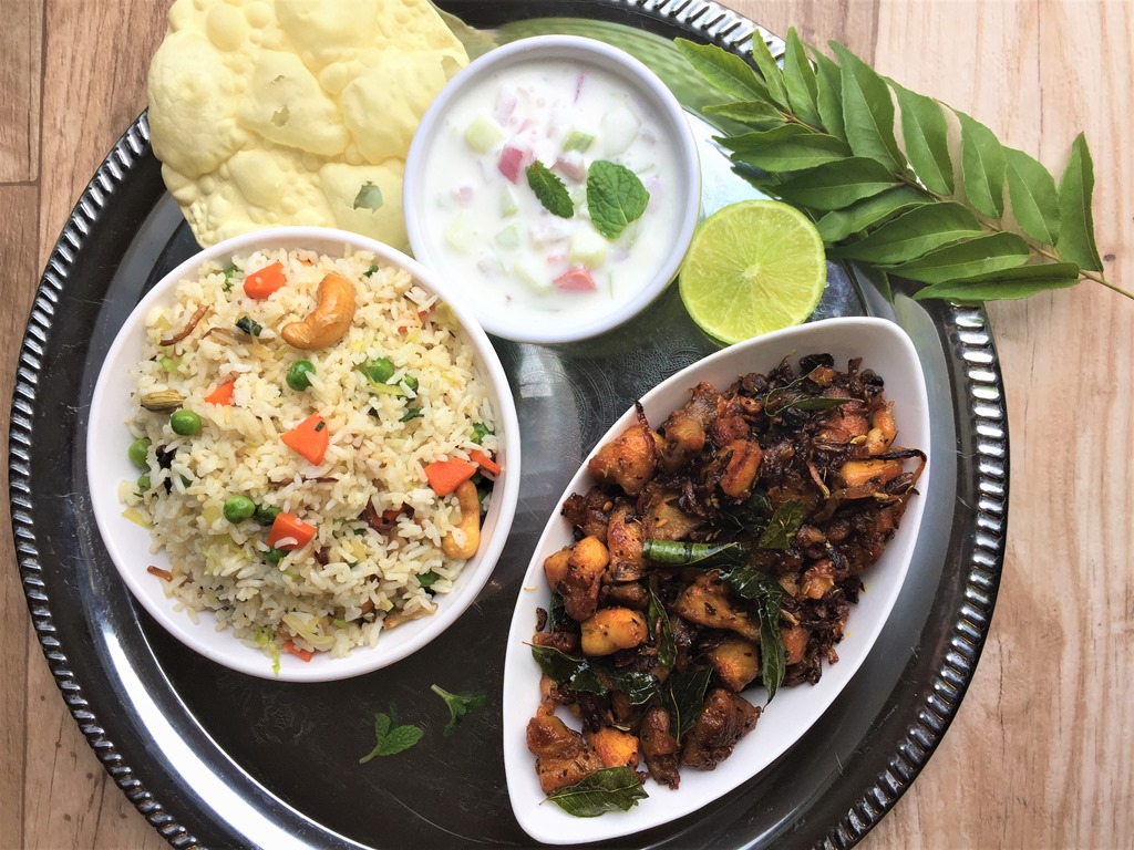 Combine all the above ingredients in a large bowl. Check for salt. Set aside for 10 minutes. Serve with vegetable rice / pulao / biriyani