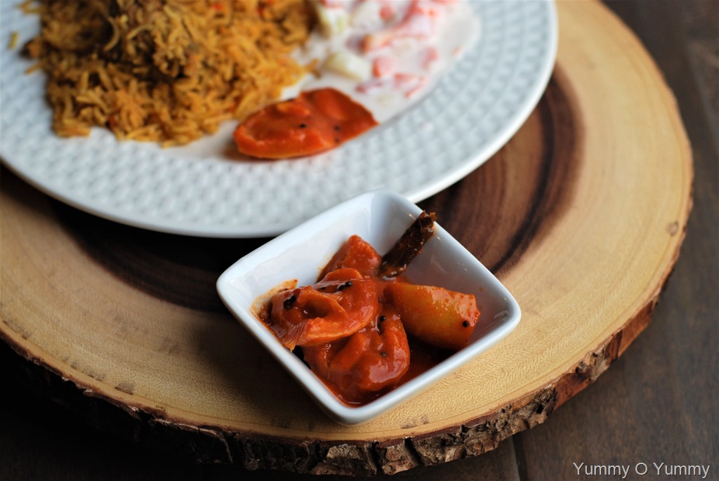 3. Heat 1 tbsp gingelly oil in a small pan. Cool completely. Pour the cooled oil on top of the pickle. You can have it after 2 – 3 days but it tastes best after a month. Keep refrigerated in order to increase its shelf-life. It tastes best with biriyani / pulao.