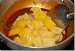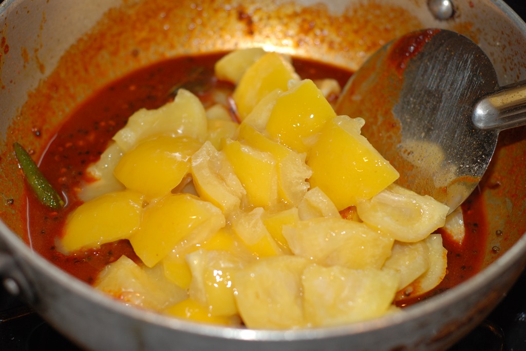 2. Heat 2 – 3 tbsp gingelly oil in a deep pan. Splutter mustard seeds and fry dry red chilies and fenugreek seeds. Add sliced ginger, garlic and green chilies. Fry until lightly golden. Bring down the heat to low. Add turmeric powder, chilly powder, fenugreek powder and hing. Saute for a minute. Next add sugar, vinegar and salt. Cook for a minute. Add lemon pieces and switch off. Set aside to cool. Add kaduku parippu, if using and mix well. Transfer to an airtight jar.