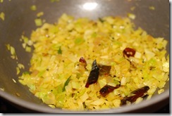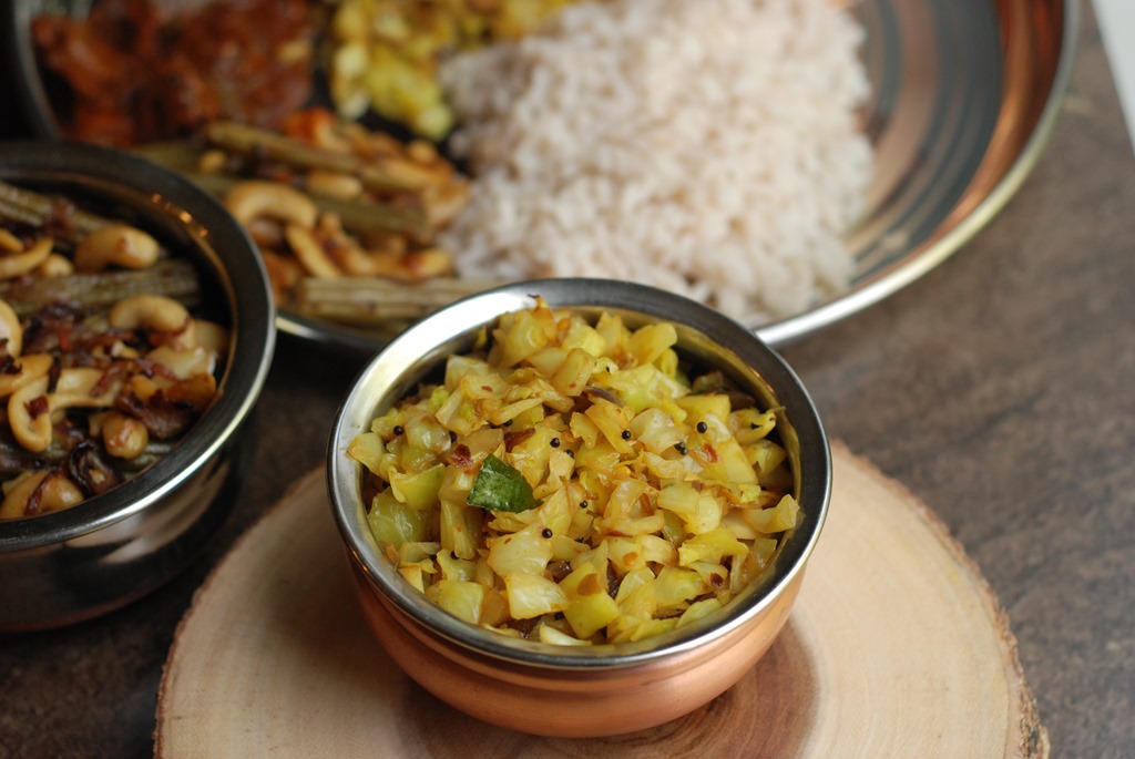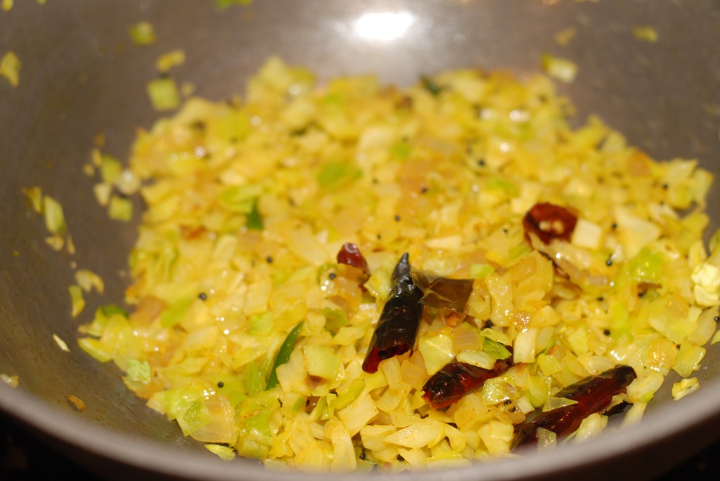 Heat coconut oil in a cheena chatti / pan over medium heat. Splutter mustard seeds and fry dried red chilies. Add onion, little salt, ginger, green chilies and curry leaves. Saute until onion turns translucent. Add turmeric powder, little chilli powder and cook for a minute. Add chopped cabbage, salt and mix well. Cook covered for a few minutes. Open the lid and cook for a few more minutes until completely cooked and dry. Serve warm with rice, pulisseri and other side-dishes.