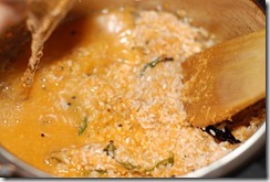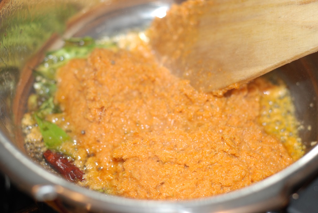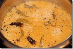 3. Heat coconut oil in a pressure cooker (2 or 3 liter) over medium heat. Splutter mustard seeds and fry dried red chilies and curry leaves. Add ground coconut paste and saute for 1 minute. Add drained rice and 2 cups of hot water. Bring it to a boil. Add salt, to taste. Cover with lid and pressure cook for 1 whistle. Open the lid after 10 – 15 minutes.