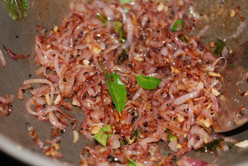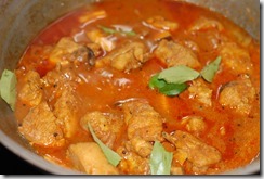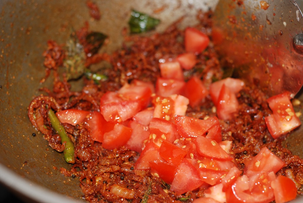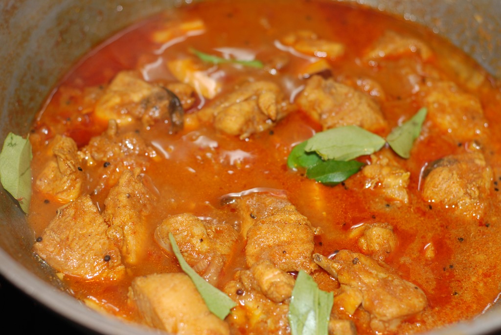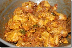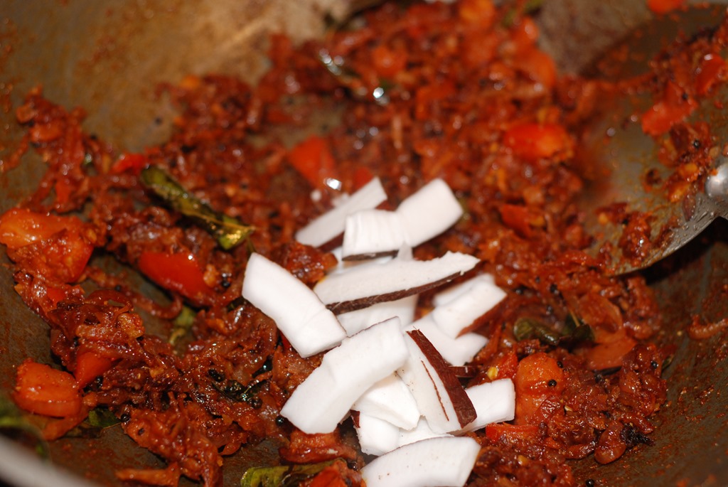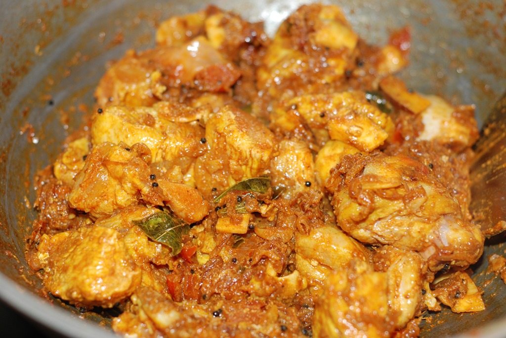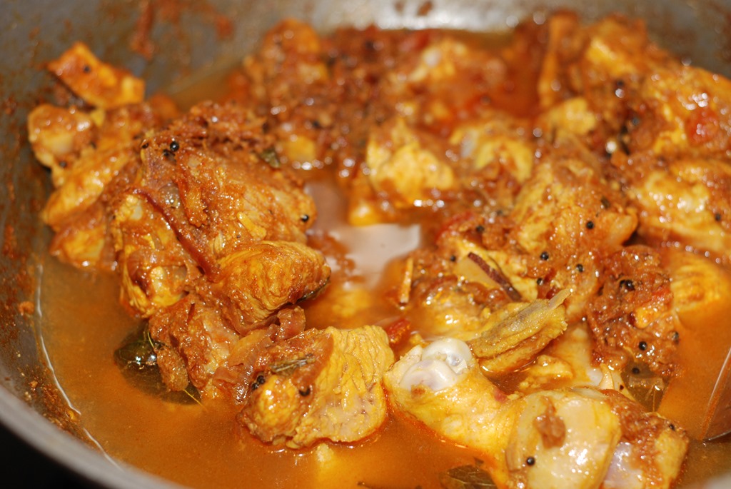 2. Heat coconut oil in a large kadai / cheena chatti over medium-high heat. Splutter mustard seeds (optional) and add onion, little salt, ginger, garlic, green chilly and curry leaves. Saute well until onion turns golden. Bring down the heat to low. Add the spice powders numbered 6 and mix well. Cook for a few minutes until their raw smell completely disappears. Add tomato and cook over medium heat until mushy. Add garam masala powder and sliced coconut / thenga kothu and mix well. Taste-check for salt. Add chicken pieces and cook for a few minutes, stirring in between. Add 1 – 1.5 cup hot water and mix well. Bring to a boil. Cook covered for about 30 – 35 minutes over low-medium heat until oil separates and chicken pieces are completely done. Switch off. Add a few curry leaves and 1 tsp coconut oil. Serve after 30 minutes.