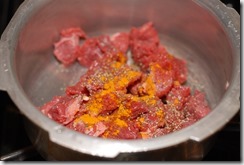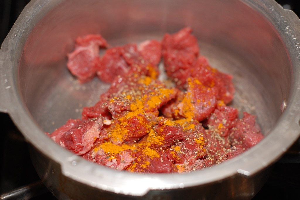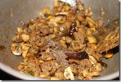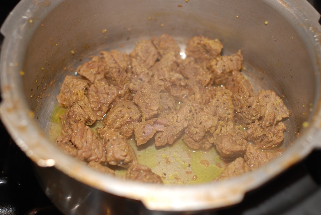 1. Cook beef with the other ingredients numbered 1 for 3 – 4 whistles until soft. Cut into small pieces.