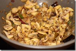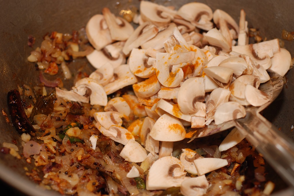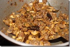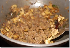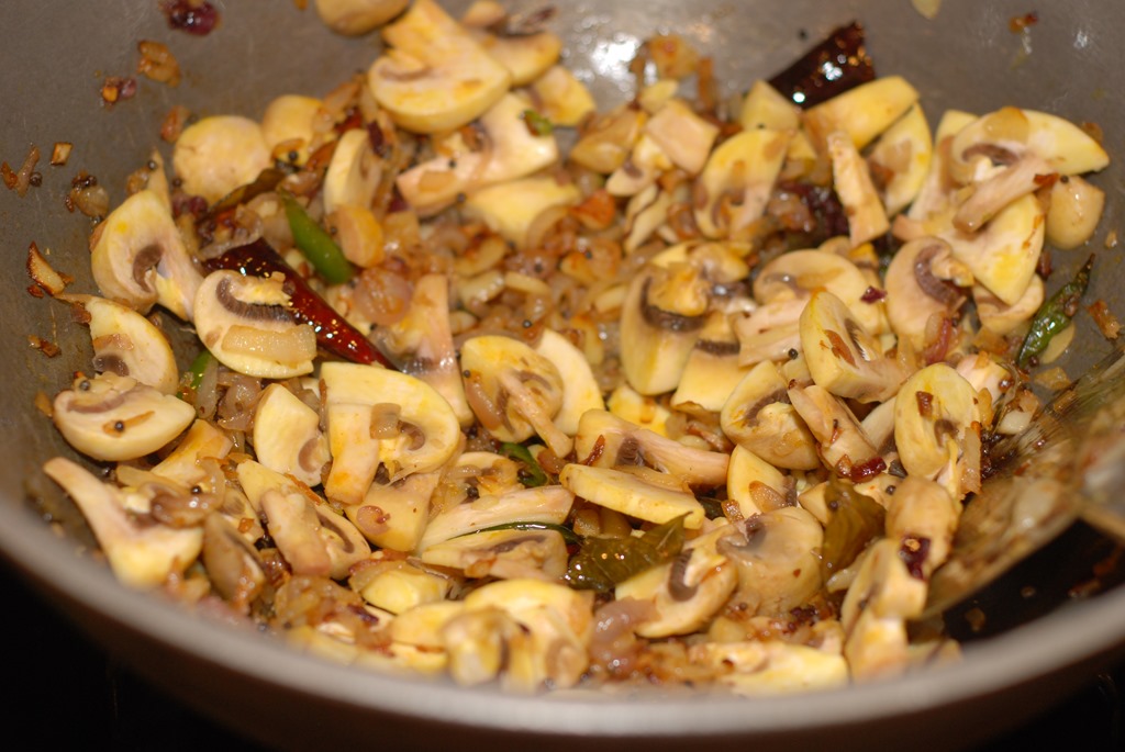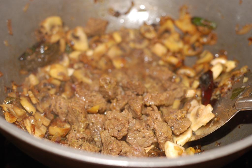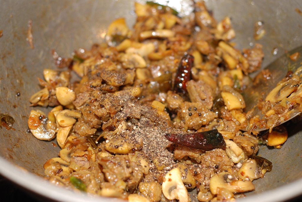 2. Heat coconut oil in a kadai / pan over medium-high heat. Splutter mustard seeds and fry dried red chilies. Add shallots, little salt, ginger, garlic, green chilies and curry leaves. Saute until light golden. Add mushroom pieces, salt and turmeric powder. Saute for 4 – 5 minutes. Add cooked beef pieces and fresh ground pepper powder. Mix well. Cover and cook for a few minutes. Switch off. Serve with rice / chapathi.