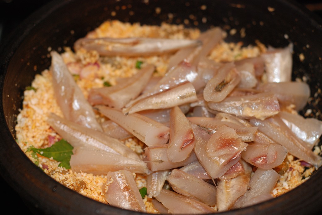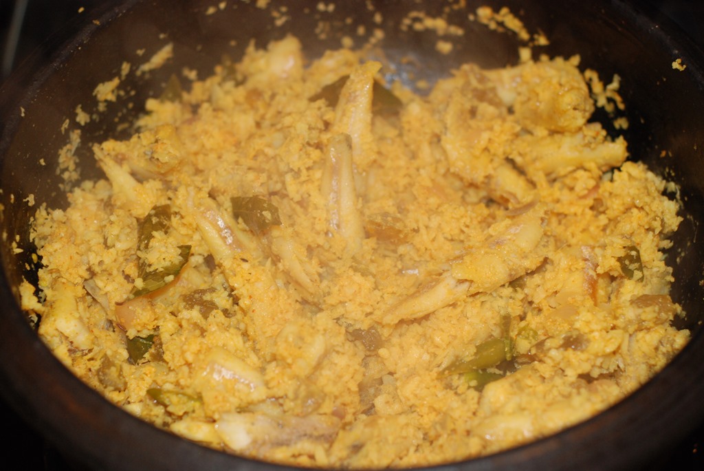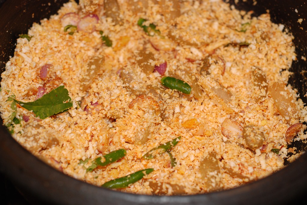 2. Add the cleaned fish pieces, ilumban puli pieces and mix well. Add half cup water and mix well. Cook covered over medium-low heat for 15 – 20 minutes until done. Open and cook uncovered for a few minutes until most of the water is evaporated. Switch off. Add coconut oil and a few curry leaves. Mix gently. Keep covered for a few more minutes. Serve with rice.