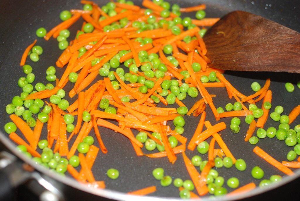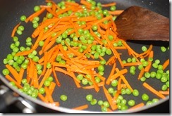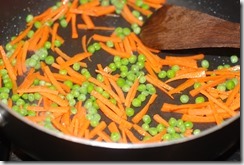 2. Heat 1 – 2 tbsp ghee/coconut oil in a wide pan at medium-high heat. Fry cashews until golden and drain well. Next add raisins and fry until plump. Drain well. Next add carrot  and fresh green peas. Fry for 5 – 6 minutes stirring twice or thrice in between. Drain on to a paper towel.