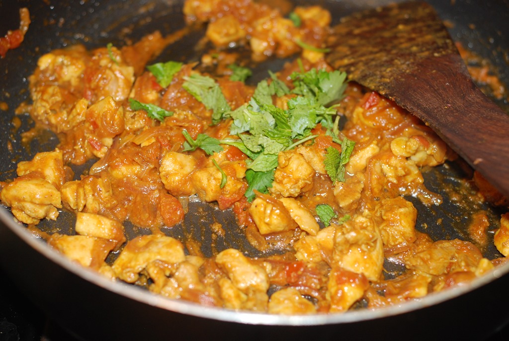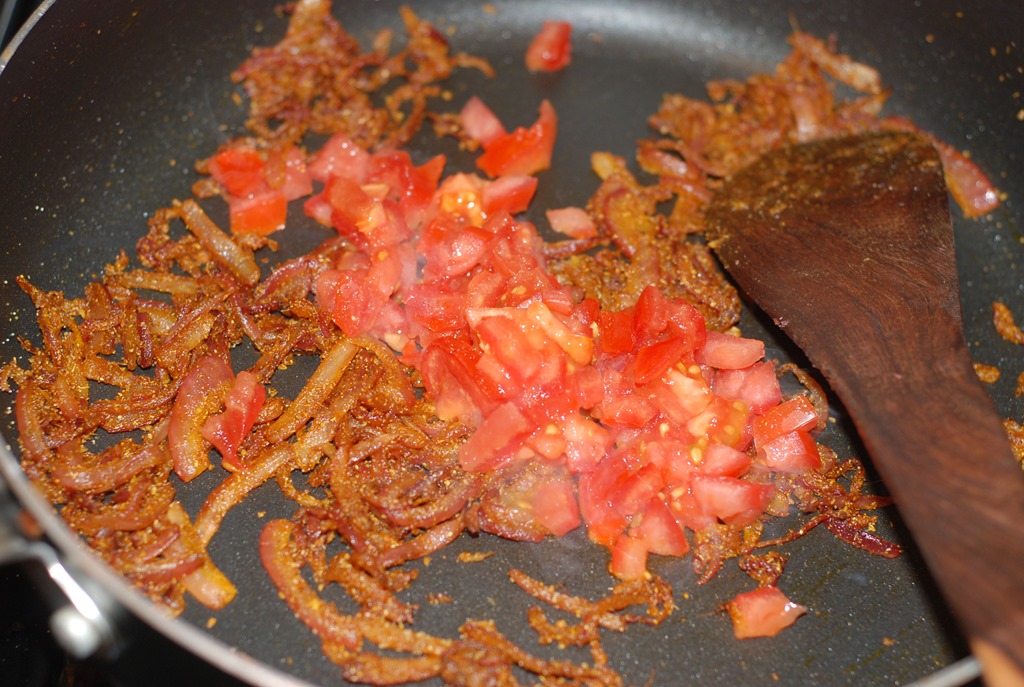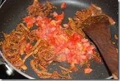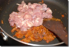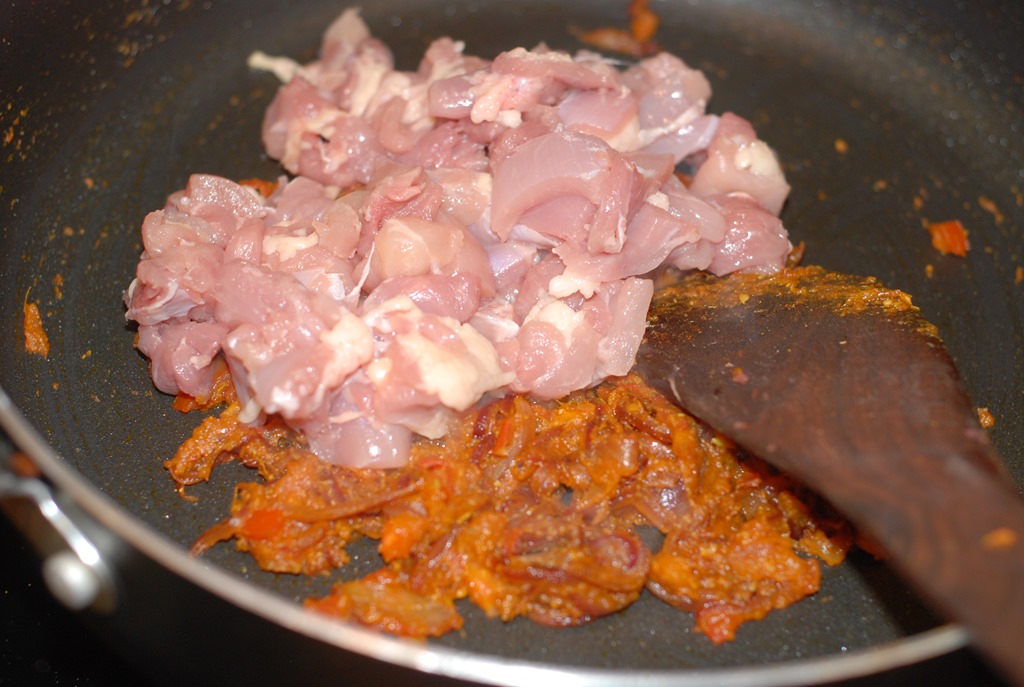 4.  Heat 1.5  tbsp oil in the same pan  and add onion and little salt. Fry until transparent. Next add onion, ginger, garlic, green chilies and stir until onion turns golden. Add turmeric powder, chilly powder and garam masala powder. Stir until their raw smell is gone. Add tomatoes and stir until mushy. Finally add chicken pieces and mix well. Cook for 5 – 6 minutes until done. Sprinkle 2 tbsp chopped mint and cilantro. Switch off. Transfer half of the chicken mixture into a bowl.