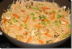 1. Heat 1 tsp ghee / oil in a deep pan. Add the whole spices and stir for a few seconds until fragrant. Add roasted semiya and stir for a few seconds until it is coated with ghee (if you are using unroasted semiya, roast it for a few minutes or until golden before proceeding with the recipe). Add hot water / chicken /vegetable stock, mint leaves, cilantro and lemon juice. Add salt to taste. Cook covered until vermicelli is done, about 5 – 6 minutes at medium heat, stirring once in between so that it wont stick to the bottom. Fluff with a  fork and set aside. (It will look sticky and clumpy while hot, but don’t worry it will be okay when it cools down a bit.)
