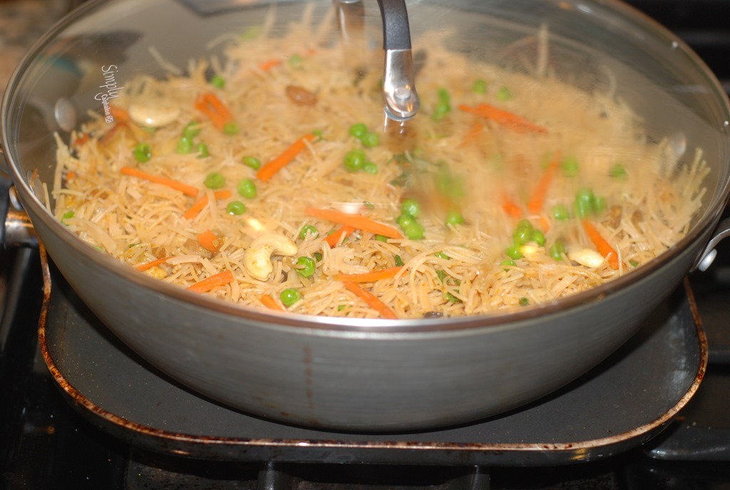 5. To layer – Remove half of the chicken mixture into a bowl and set aside. Top the remaining chicken mixture in the pan with 2 tbsp each cashews, raisins, chopped cilantro and mint. (You can add a tsp of ghee,if you want). Top it with half of the cooked semiya. Next add the remaining chicken mixture. Top again with cashews, raisins, chopped mint, cilantro and the remaining cooked vermicelli. Cover with lid. Place this pan on a griddle/large tawa and cook for 4 – 5 minutes at medium-low heat until steam condenses on the lid as shown in the picture above. Switch off. Open after 10 minutes.Mix gently. Mix well. Serve hot with pickle, raita and pappadam.