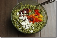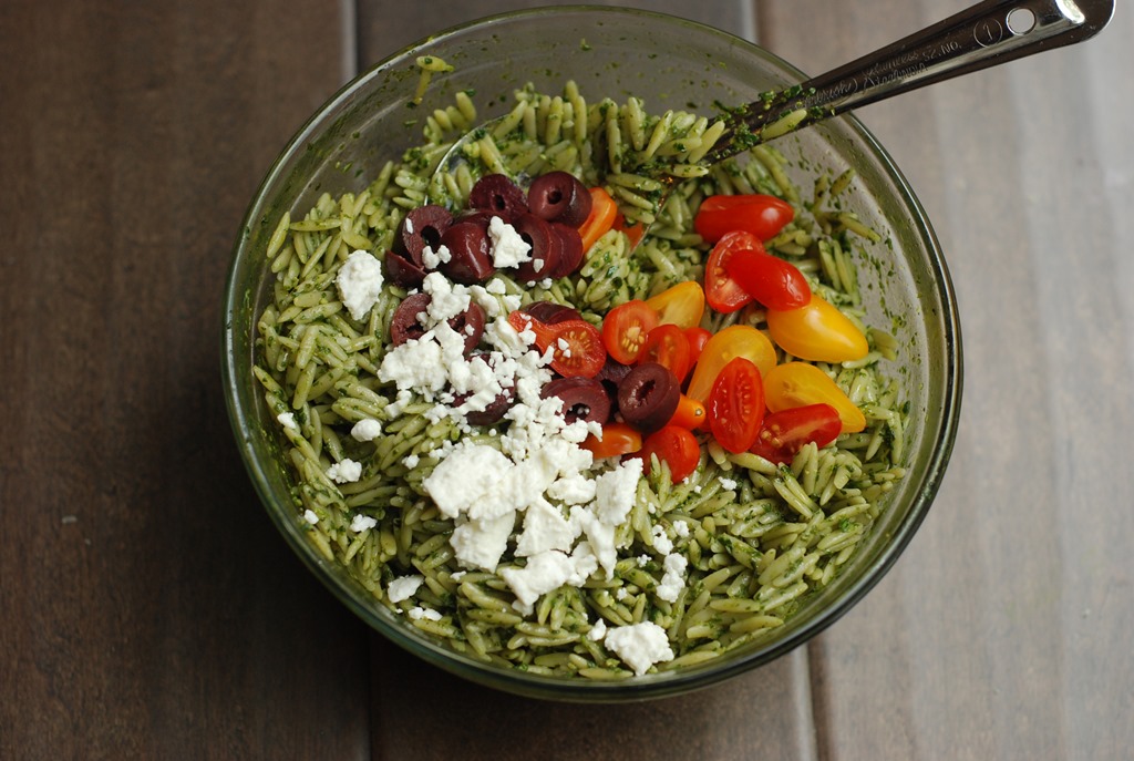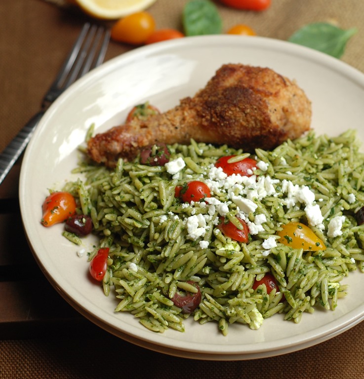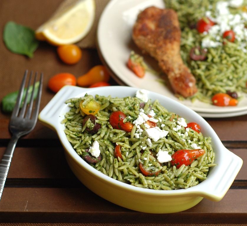 2. Cook orzo pasta according to package instructions. Drain well. While still warm, add the spinach pesto and 2 tbsp parmesan cheese to the cooked orzo and mix well. Add sliced cherry tomatoes, olives, crumbled feta cheese and toss well. Enjoy as a side-dish with grilled chicken!