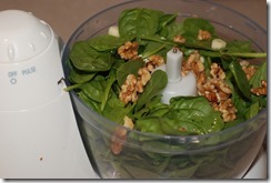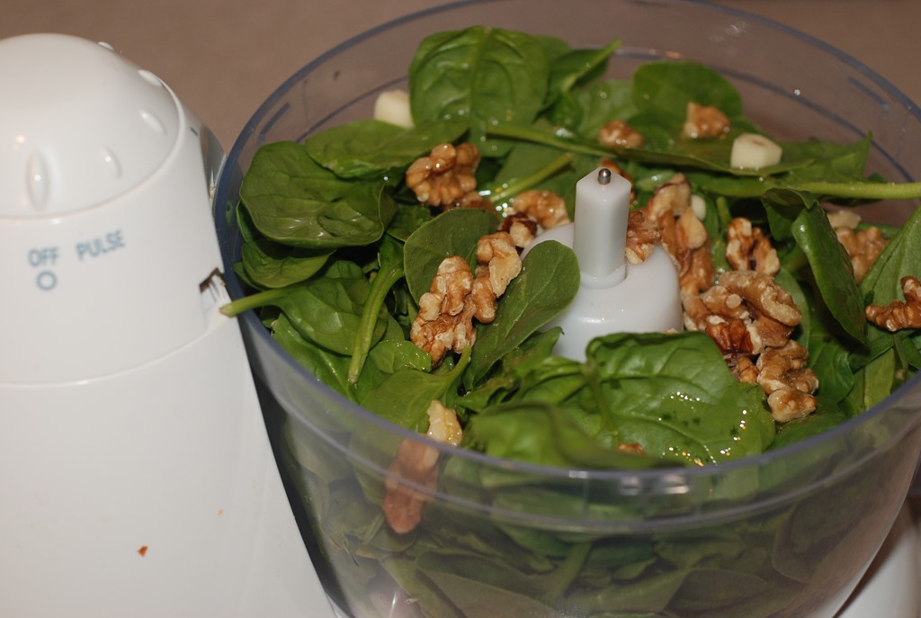 1. Place the spinach, basil leaves, garlic, walnuts, lemon juice and 2 tbsp olive oil. Blend until smooth scraping sides in between. Add remaining olive oil while blending. Transfer to a small bowl. Add salt, pepper and 2 tbsp grated parmesan cheese.