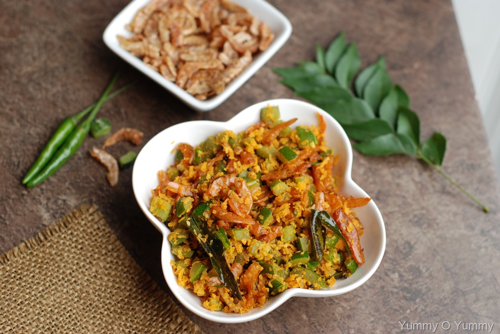 2. Heat oil in a cheena chatti / kadai over medium heat. Splutter mustard seeds and fry dry red chilies. Add padavalanga pieces, chopped shallots, green chilies, curry leaves, dried shrimp and grated coconut mixture. Sprinkle 2 – 3 tbsp water. Cover and cook for 8 – 12 minutes over low or low medium heat, stirring in between. Switch off when done. Serve with rice and other side-dishes.