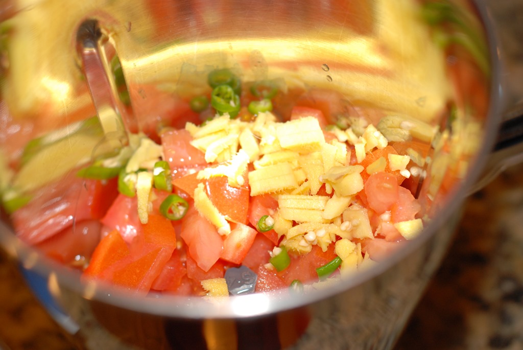 1. Grind tomato, ginger and green chilies in the large jar of a blender.