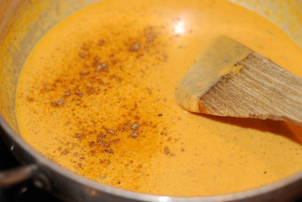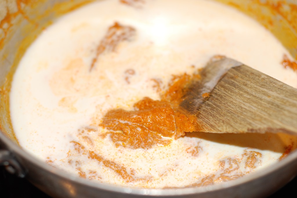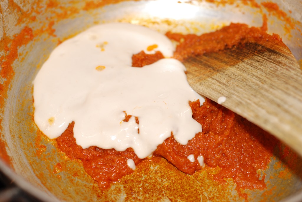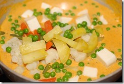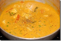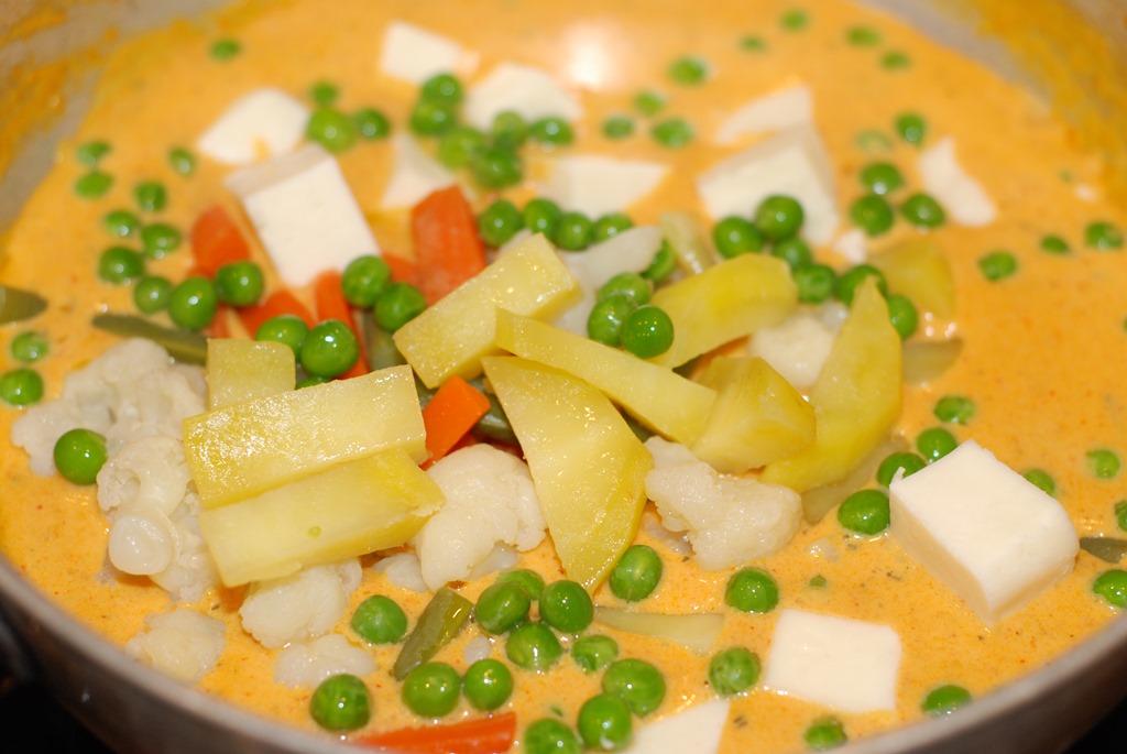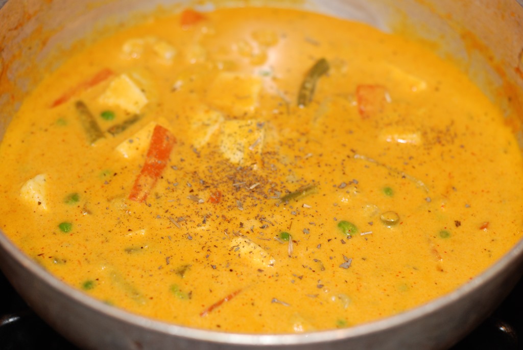 3. Heat butter in a kadai. Add ground tomato, little salt and cook covered for 10 – 15 minutes until moisture is completely gone and butter separates. Add turmeric powder, chilly powder, coriander powder and cumin powder. Cook over low heat until their raw smell is completely gone. Add kasoori methi and garam masala powder. Mix well. Add cashew paste and cook for 2 minutes. Add heavy cream and mix well. Next add milk. Add salt and 1 – 2 pinches of sugar. Stir continuously for a few minutes over low heat until it comes to a boil. Add steamed vegetables, fresh green peas, paneer pieces, a pinch of kasoori methi and cook covered for a few minutes over low heat. Switch off. Add a pinch of garam masala powder, if required. Finally sprinkle cilantro, if needed. Serve after 10 minutes.