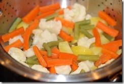 1. Vegetables – Carrot – 1 small, Potato – 1 medium, Cauliflower – 1.5 cup, cut into medium florets, Green beans – 5 – 6, cut into 1.5 inch pieces