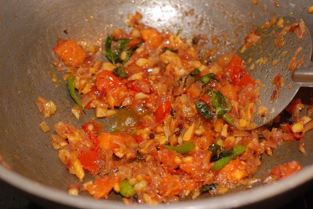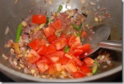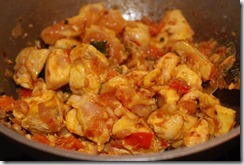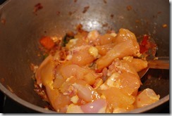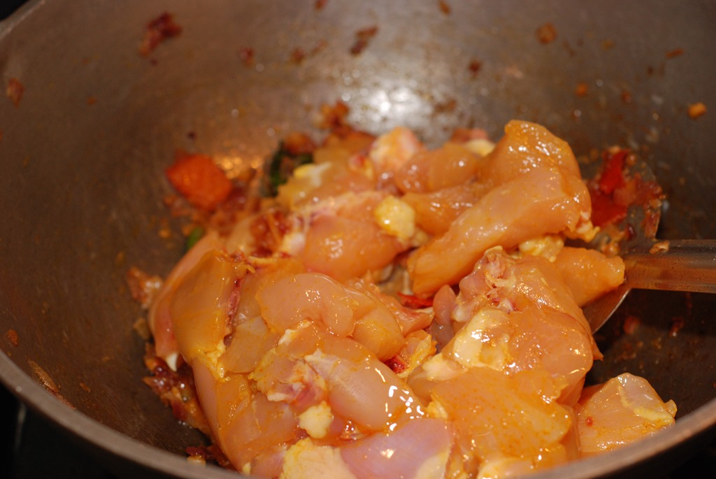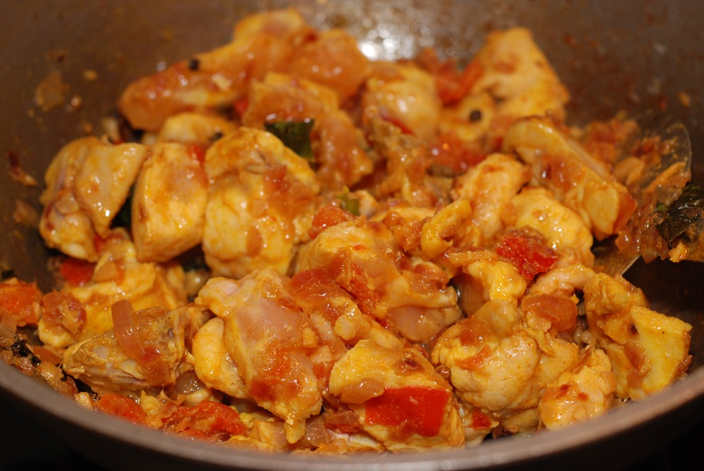 2. Heat 2 – 3 tbsp coconut oil in a heavy-bottomed pan / kadai over medium-high heat. Add chopped onion, little salt, ginger, garlic, green chilies and curry leaves. Saute everything until onion turns light golden. Add turmeric powder, coriander powder and garam masala powder. Cook until their raw smell disappears. Add tomato pieces and cook for a few minutes. Add chicken pieces and mix everything well. Cook until water starts to ooze out from the chicken, about 4 – 5 minutes.