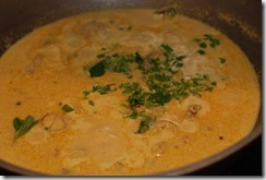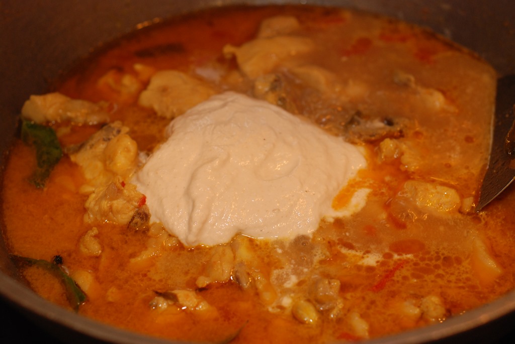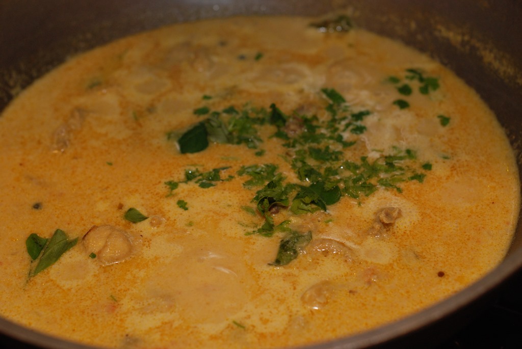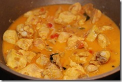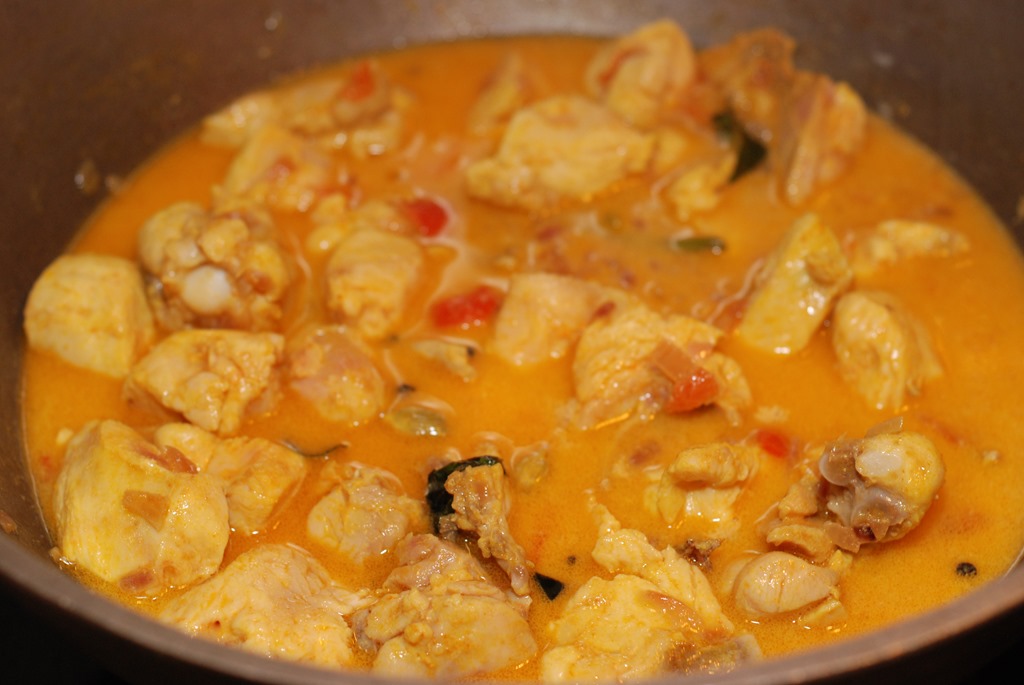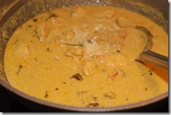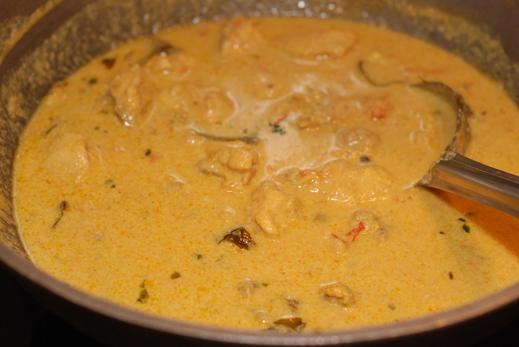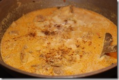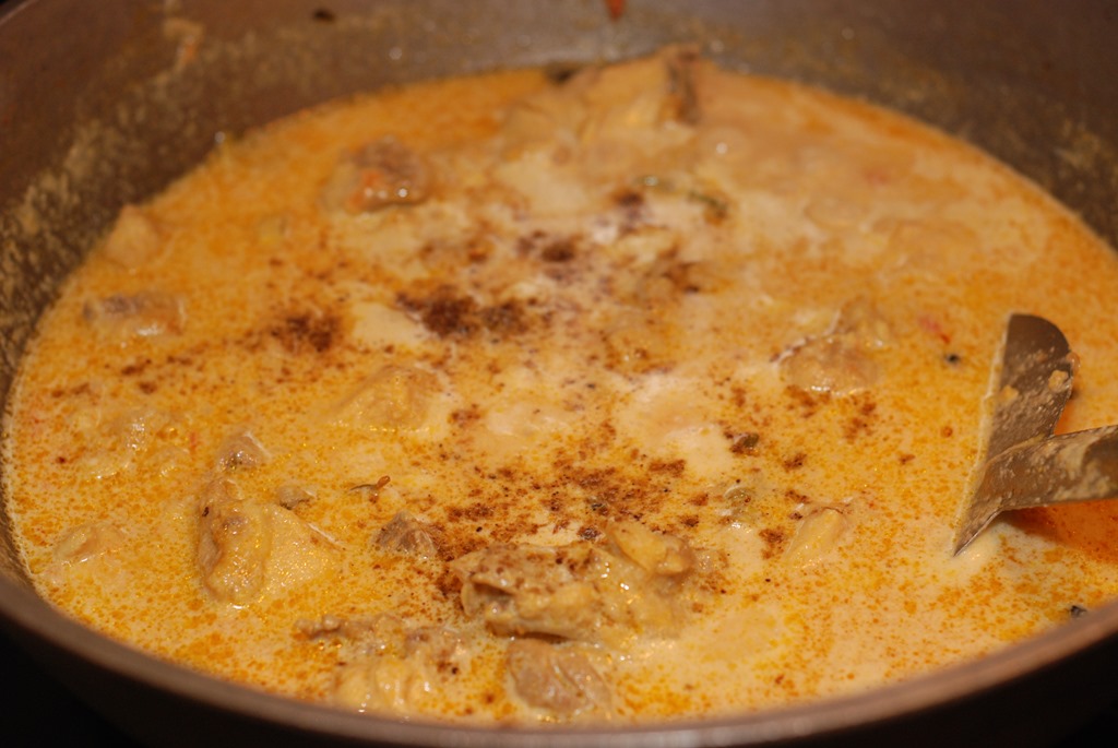 3. Add 1 – 1.5 cups of hot water / thin coconut milk. Mix well. Bring to a boil. Cover and cook over medium-low flame until chicken is done and oil floats on top, stirring occasionally, about 25 – 30 minutes. Open and add ground coconut paste. Cover and cook for a few minutes. Taste-check for salt. Add 1 – 2 pinches of garam masala powder. Mix well and switch off. Garnish with finely chopped cilantro. This Malabar style chicken kurma goes well with pathiri, ghee rice, appam, coconut rice, chapathis, porotta, idiyappam etc.![]()