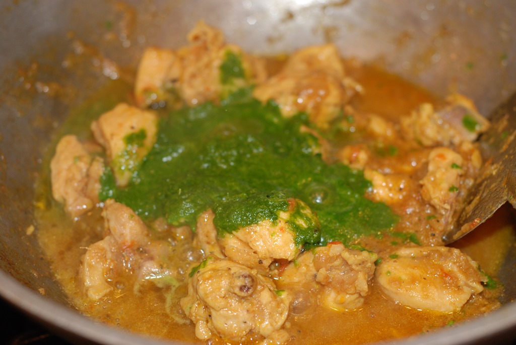 Heat coconut oil in a kadai over medium-high. Add onion, ginger, garlic, green chilies and little salt. Saute until onion turns golden. Add chopped tomato and saute for a few minutes. Add turmeric powder, garam masala powder and pepper powder. Mix well. Add chicken pieces and mix well. Cook covered over low-medium heat, stirring occasionally until almost done. Add coriander paste and mix well. Cook for a few minutes. Add coconut milk and cook for a minute. Add 1 tsp ghee. Mix well and switch off.