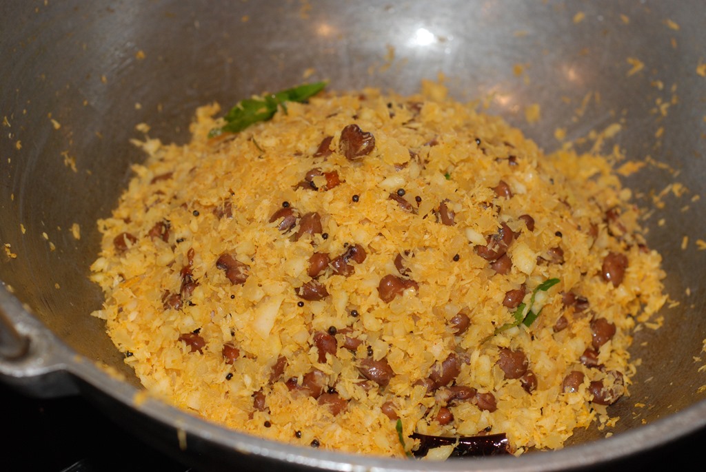 2. Heat oil in a wok/cheena chatti / kadai. Splutter mustard seeds and fry dried red chilies, urad dal and curry leaves. When urad dal turns golden, add chopped papaya, grated coconut mixture and salt. Mix well. Sprinkle 2 – 3 tbsp water. Bring everything to the center of the wok. Cover and cook for a few minutes. Add cooked vanpayar. Mix well. Again cover and cook for 6 – 8 minutes until completely done. Serve with rice and other side-dishes.