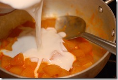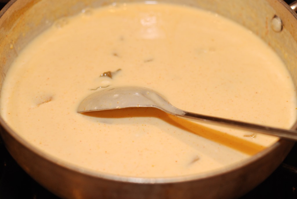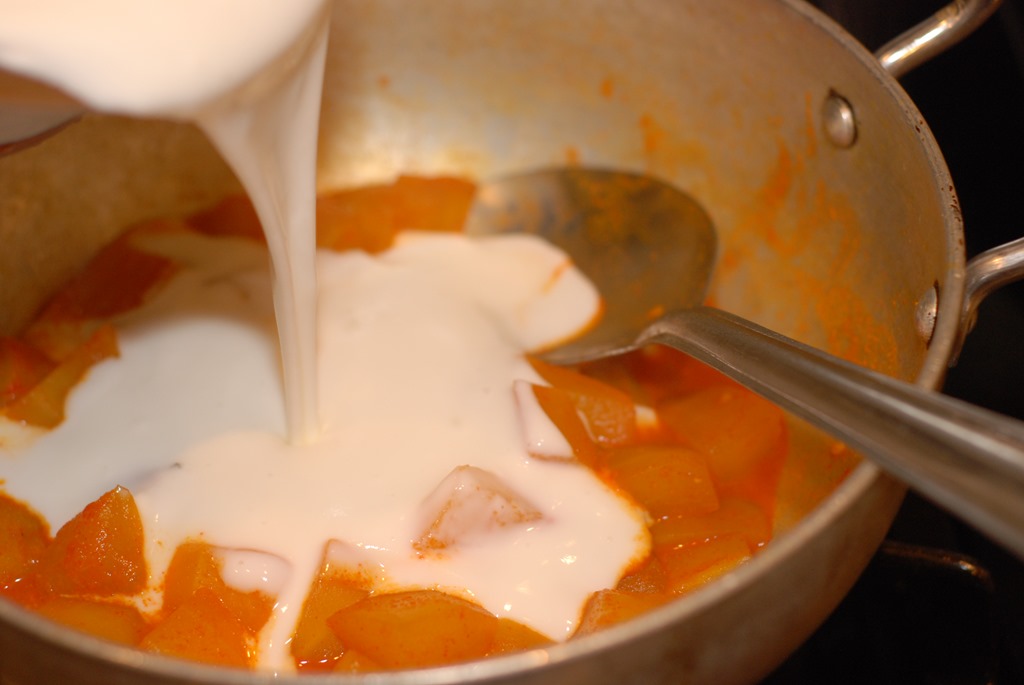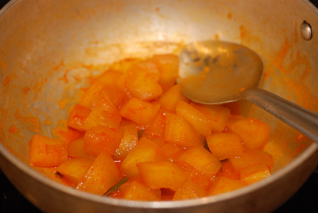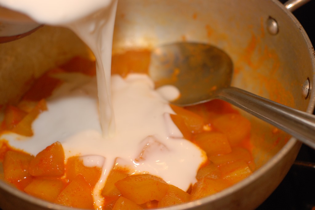 1. Cover and cook the ingredients numbered 1 for about 10 minutes until most of the moisture evaporates. Add beaten yoghurt and mix well. Stir continuously for a few minutes until heated through (do not boil).