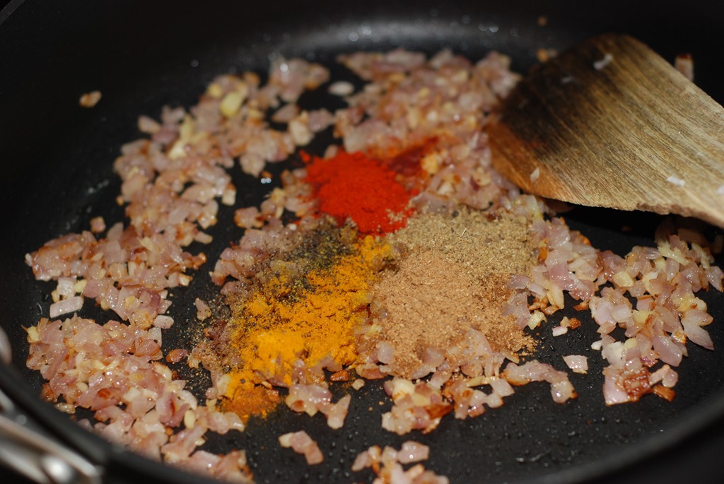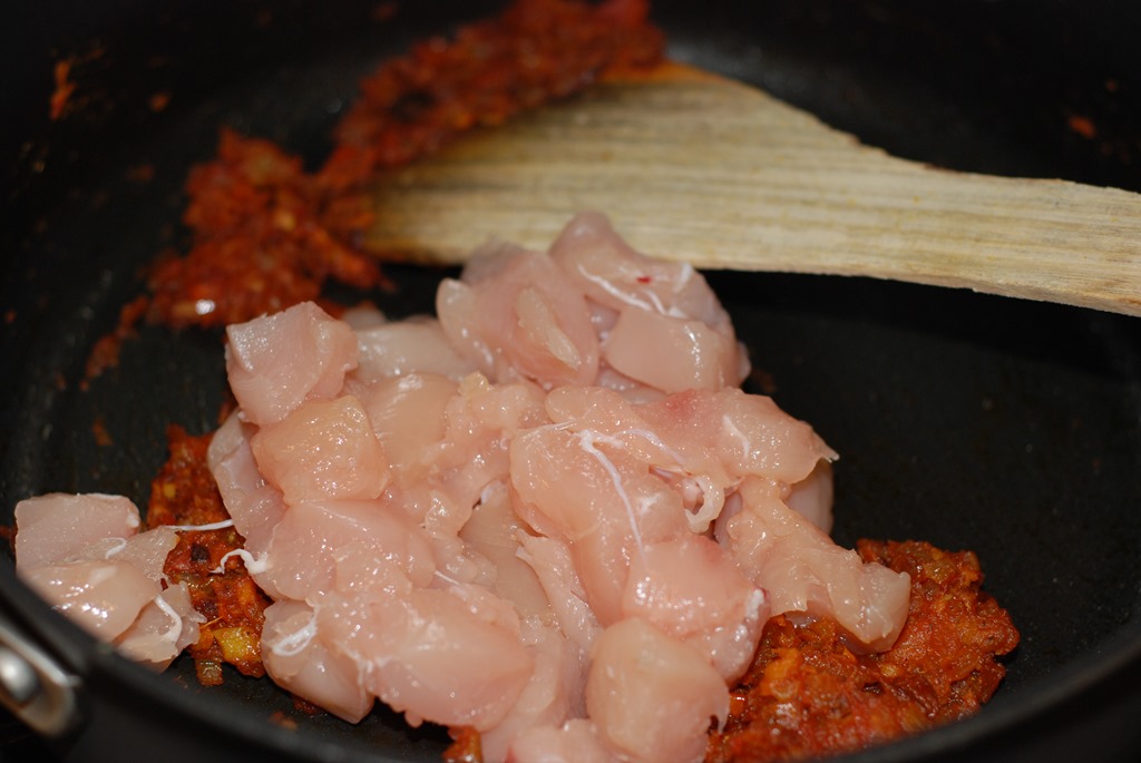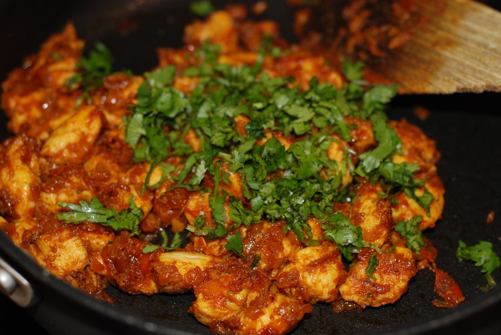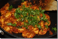1. Heat oil in a pan over medium heat. Add onion, little salt, ginger, garlic, green chilly and saute until light golden. Add spice powders numbered 4 and saute until raw smell disappears. Add chopped tomato and cook until mushy. Add chicken pieces, salt and cook for 8 – 10 minutes until completely cooked. Taste-check and add salt, garam masala powder, if required. Switch off. Sprinkle chopped cilantro.