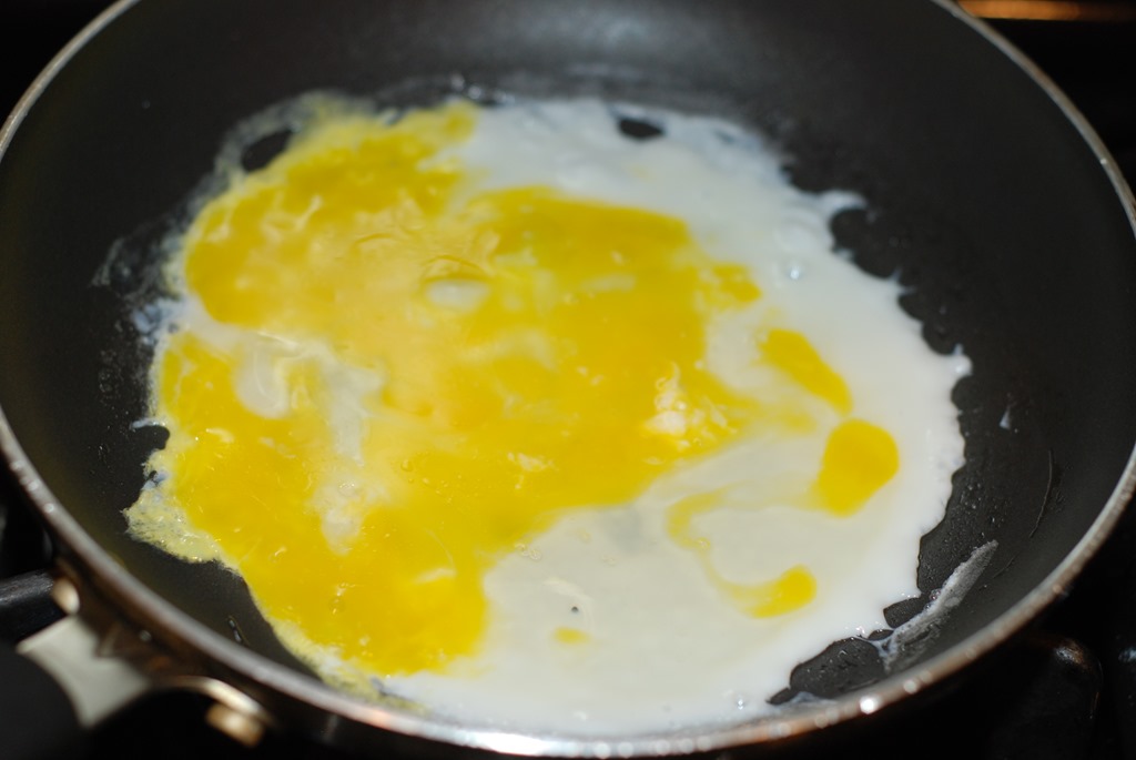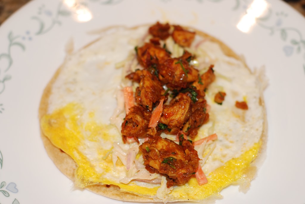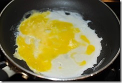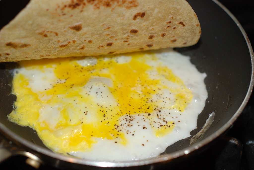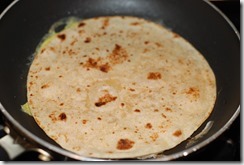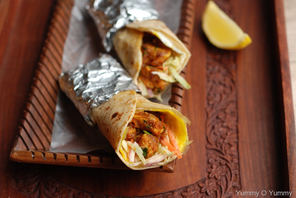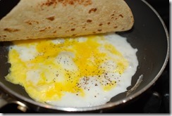 3. Heat 1 tsp oil in a small pan over medium heat. Add a beaten egg and swirl it around so it spreads to the entire surface. ( Instead of this, you can pour the lightly beaten egg on cooked chapathi / paratha and spread it using a spatula to cover the chapathi completely. Cook for a minute and then flip to cook the egg completely.) After a few seconds, place a chapathi on top and press gently. Cook for a minute until the egg is done. Sprinkle little oil on the chapathi and then flip it. Cook for a few seconds. Remove it to a plate with the egg side facing up. Top it with cooked chicken and the vegetable mayo mixture. Wrap up the roll using an aluminium foil, paper towel or wax paper to hold it together. Yummy rolls are ready to enjoy!!