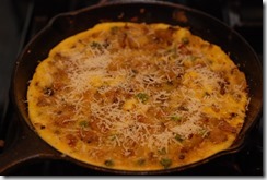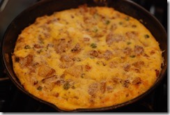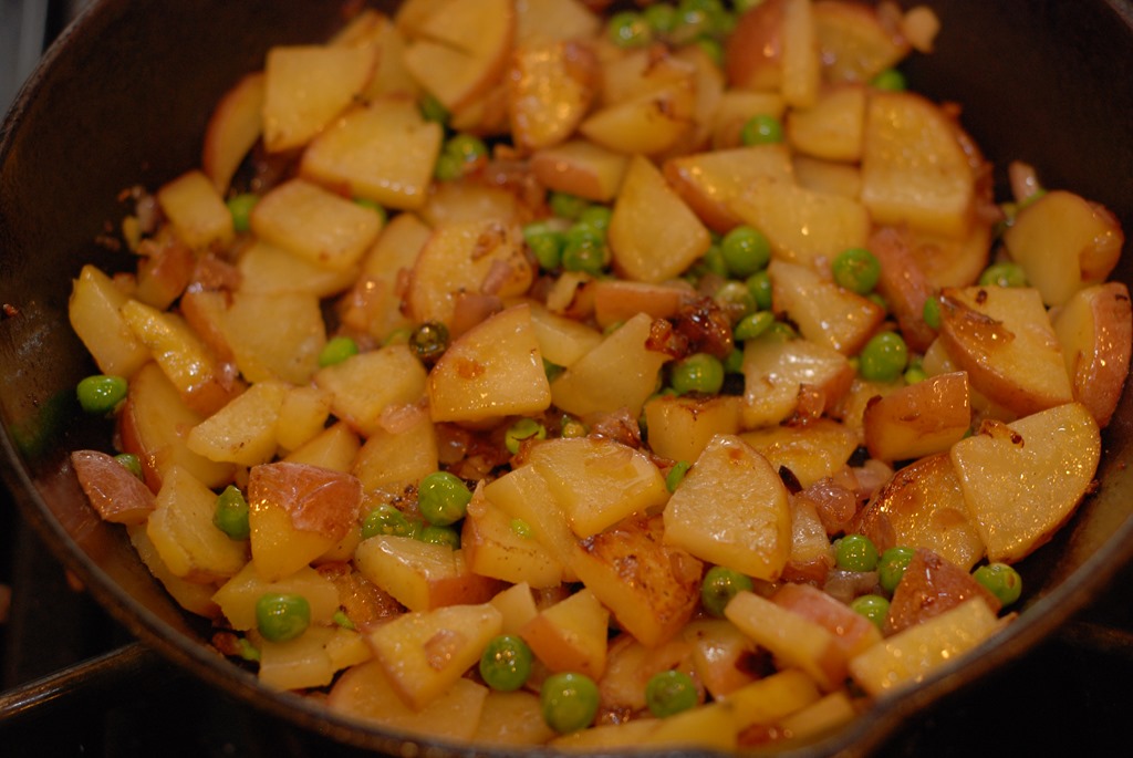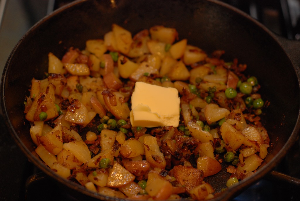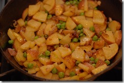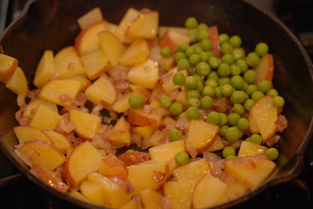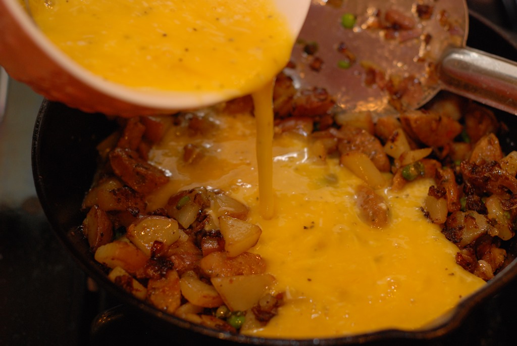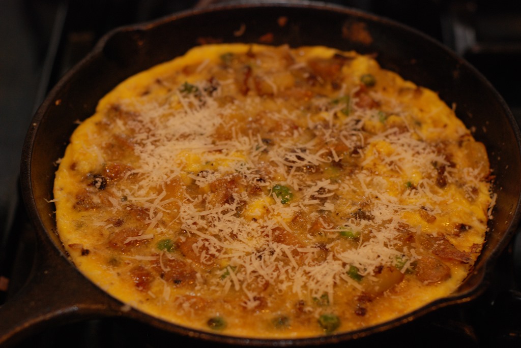 1. Heat 1 tsp oil in a cast iron pan or a pan with ovenproof handle. Fry sausage until done. Remove to a bowl. Heat 1 tbsp oil in the same pan and saute onion and garlic for a minute. Next add thinly sliced potato, little salt, pepper powder and mix well. Cook until the potatoes are browned and done. Add green peas when potato is half-done. You can use a spatula to break it down into smaller pieces while cooking.
