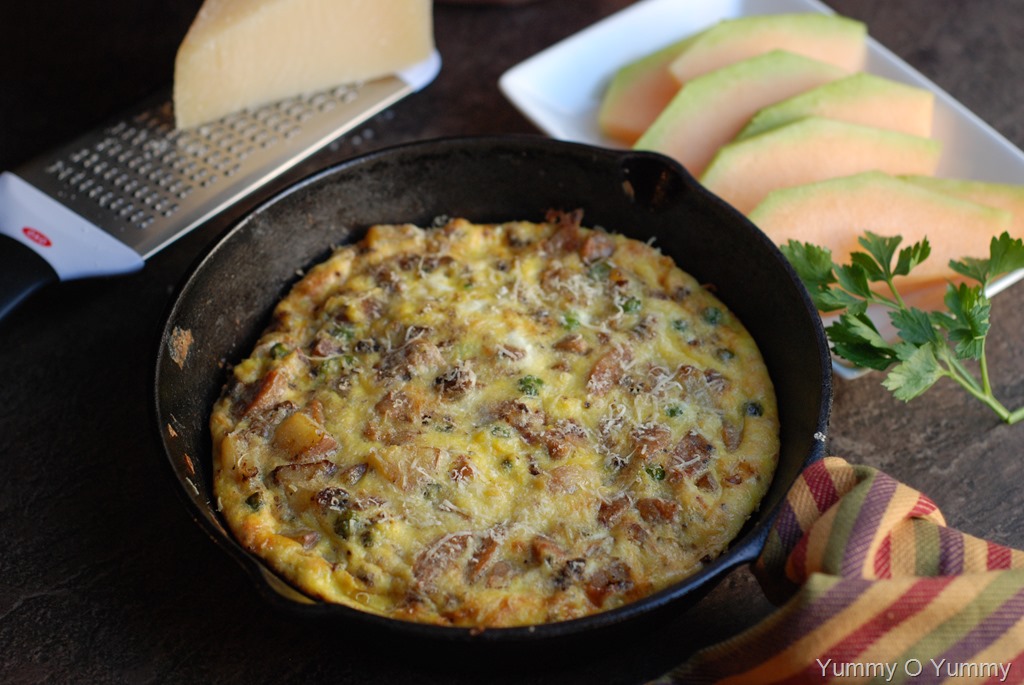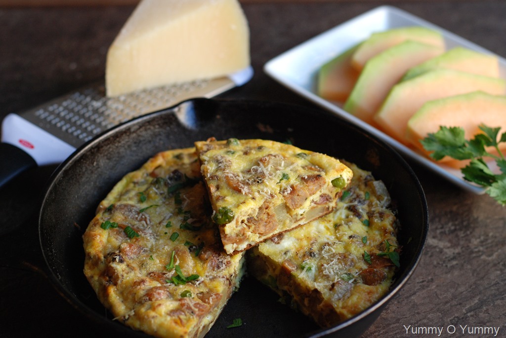 3. Add 1 tbsp butter to the cooked potatoes. Add cooked chicken sausage and mix well. Next add the egg mixture and gently mix everything in the pan. Cook for 5 – 7 minutes over low-medium heat until the bottom is browned and set. Sprinkle 2 – 3 tbsp parmesan cheese over the top. Transfer it to the oven and broil for 5 – 6 minutes until the top part is set (OR invert the frittata onto a plate and transfer back to the pan. Cook for a minute or two and switch off.) Take it out of the oven. Set aside for a few minutes. Cut into wedges and serve. Serve wedges right from pan or invert it onto a platter. Serve warm or at room temperature.