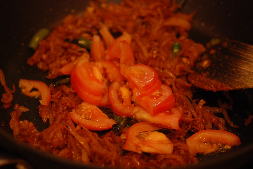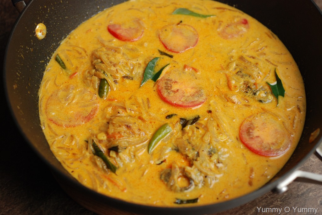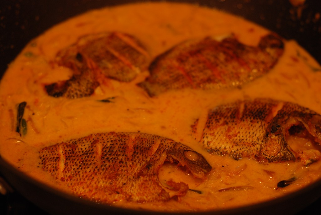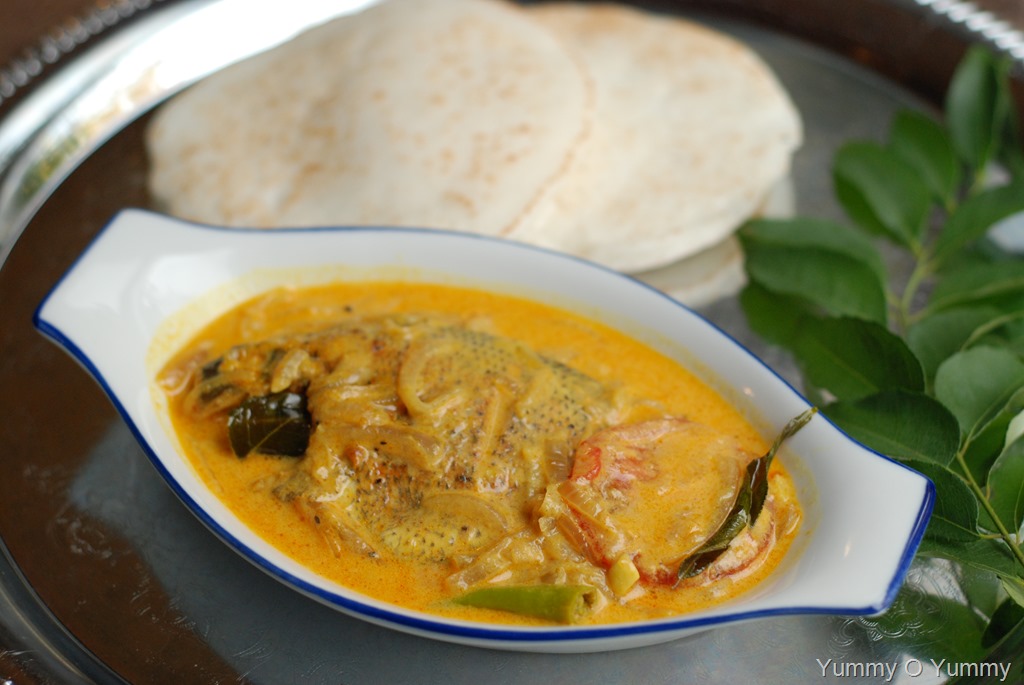2. Heat 2 – 3 tbsp coconut oil in a wide pan. Add onion, little salt, ginger, garlic, green chilies and curry leaves. Saute really well until lightly browned. Add turmeric powder, chilli powder and coriander powder. Bring down the heat to low. Cook for a few minutes. Add sliced tomato and cook until soft. Add medium thick coconut milk and salt, to taste. Cook for a few minutes. Add a pinch of pepper powder. Taste-check for salt and mix well. Carefully place the fried karimeen pieces in the gravy. Cook covered for 5 – 6 minutes over low heat. Add 1/3 cup thick coconut milk, 1/2 tsp vinegar and mix gently. Top with tomato rounds. Cook for a minute over low heat. Pour a tsp of coconut oil and add a few curry leaves. Keep covered for 5 – 10 minutes. Serve with appam / idiyappam.
