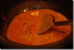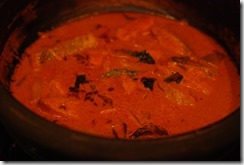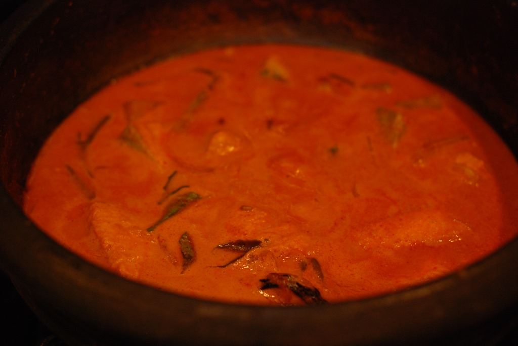 2. Cover with a lid and cook over medium-low heat for around 10 – 15 mts gently swirling the pan in between. When the fish pieces are completely cooked, add 1/4 cup thick coconut milk and a few curry leaves. Adjust the salt and switch off.
