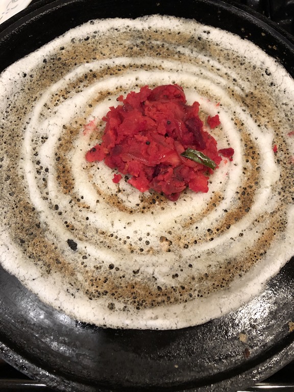 3. Heat a non-stick pan (smear some oil if you are using a cast iron pan). Pour 1/2 – 3/4 cup dosa batter (depending on the size of your pan) and spread to make a thin dosa (not very thin). Drizzle 1/2 tsp oil / ghee and cook for a few minutes over medium heat until crisp (you can flip over for a minute if the dosa is thick). Add 3 – 4 tbsp potato beetroot masala in the center or on one side. Fold and serve immediately with sambar, tomato or coconut chutney. Enjoy!