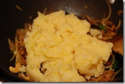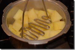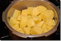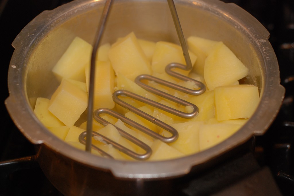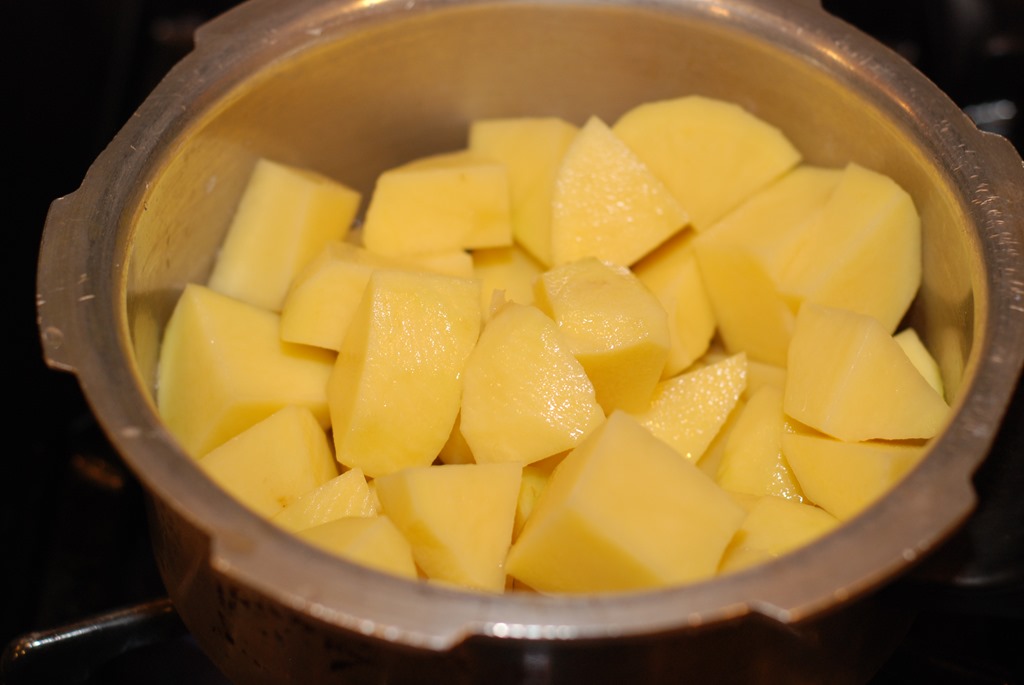 1. Pressure cook the peeled potatoes adding salt and 1/4 cup water for 2 – 3 whistles or until done. Discard excess water. Mash coarsely and set aside.