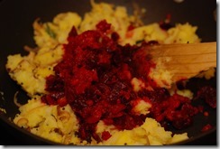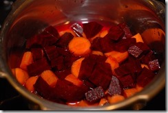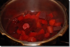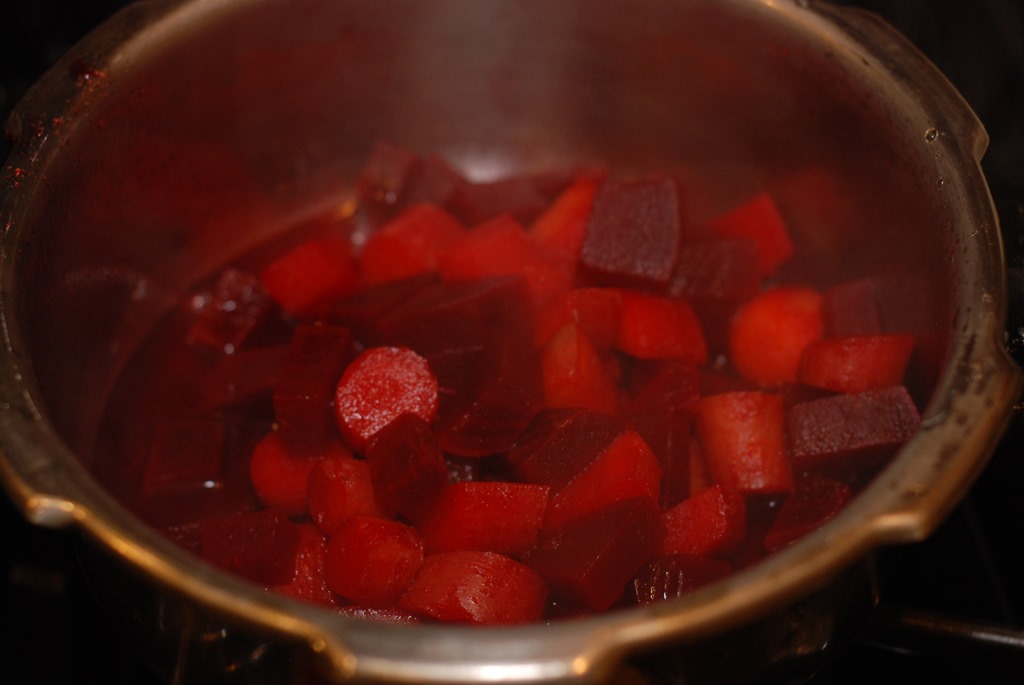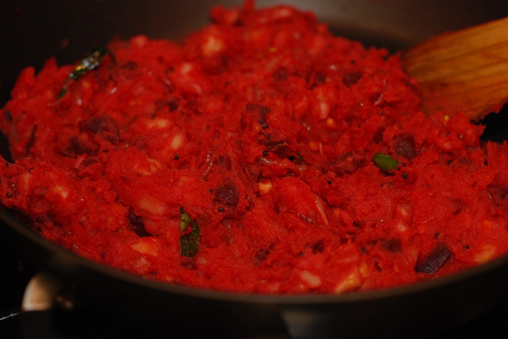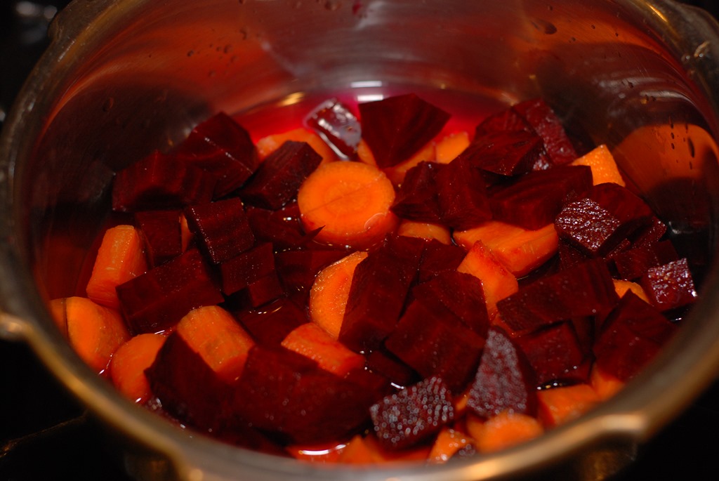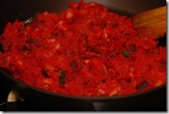 In another pressure cooker, cook beetroot and carrot adding 1/4 cup water for 2 – 3 whistles until soft. Mash slightly and set aside(do not mash completely).