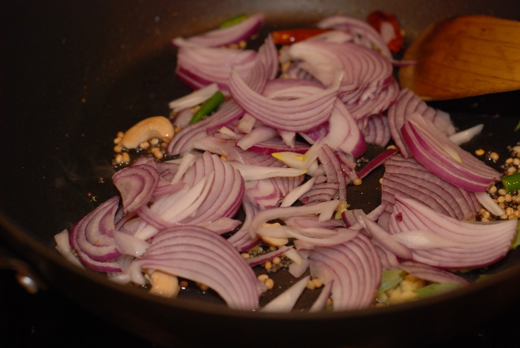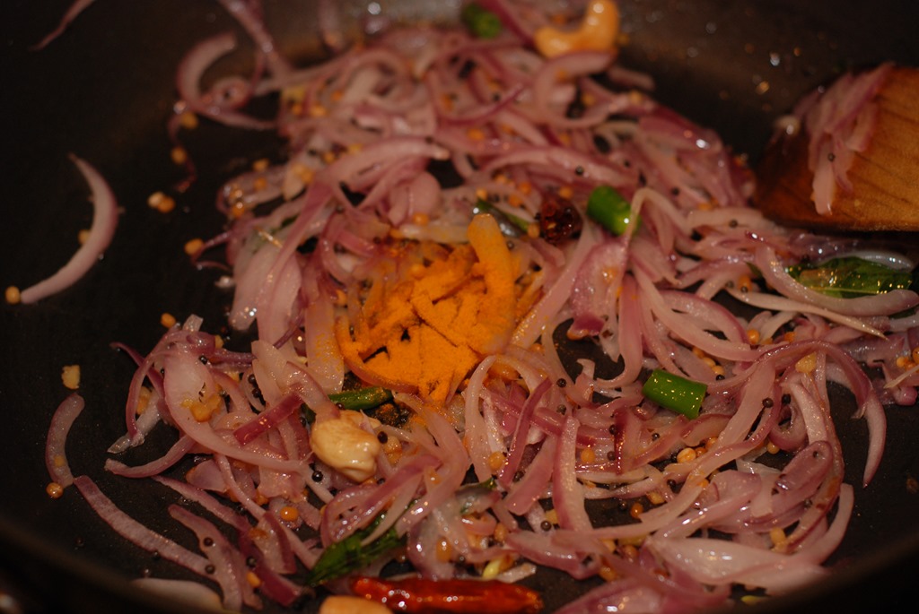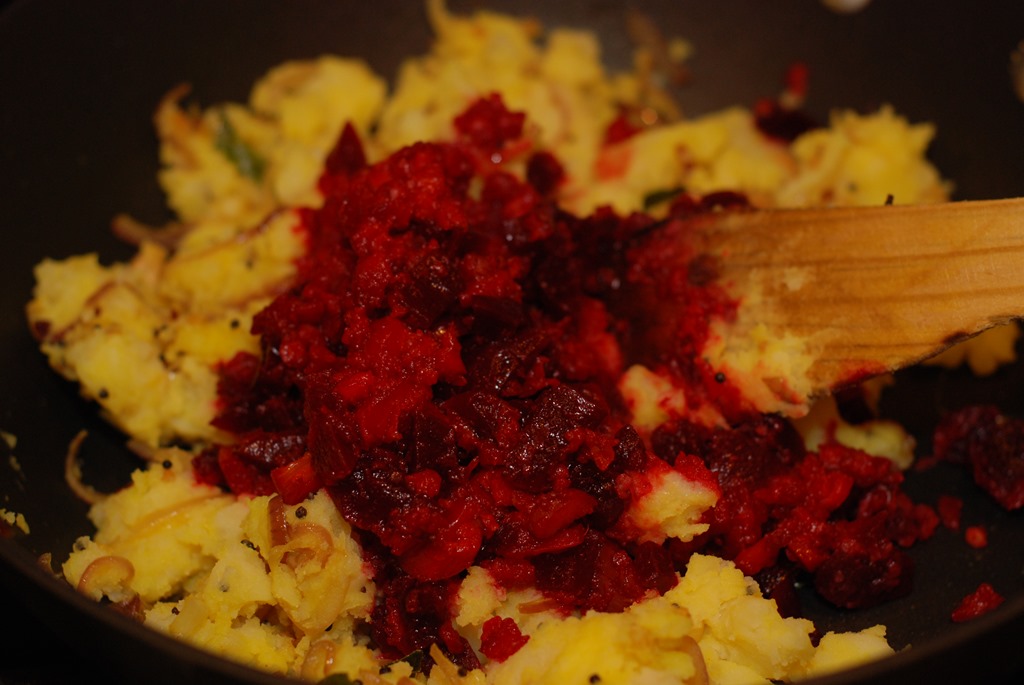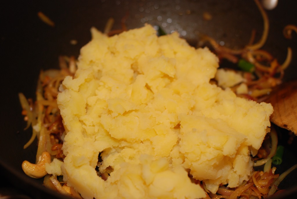 2. Heat oil in a pan over medium heat. Splutter mustard seeds and fry dried red chilly, urad dal and cashew nuts. When urad dal turns golden-brown, add a tiny pinch of asafoetida/ hing. Mix well and add sliced onion, curry leaves, ginger, green chilly and a pinch of salt. Saute until onion turns transparent. Add turmeric powder and saute for a minute. Add mashed potato, beetroot and carrot. Mix well and cook for a minute. Check for salt. Switch off.