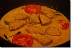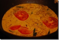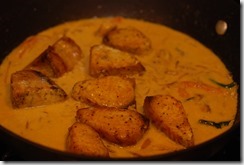 2. In the same pan, add onion, a pinch of salt, ginger, garlic, green chilies and curry leaves. Stir until onion turns light golden. Add turmeric powder, coriander powder and pepper powder. Cook until their raw smell leaves. Add medium thick coconut milk, cashew paste, few sliced tomatoes, 1/2 tsp vinegar, curry leaves and enough salt. Bring to a slow boil. Now lower the heat to low-medium and add the shallow fried fish pieces. Swirl the pan gently to mix the fish pieces with the gravy. Cover and cook for 7 – 8 minutes or until the fish pieces are completely done. Now add the thick coconut milk, a pinch pepper powder and the remaining tomato slices. Mix well and switch off. Check for salt. Add 1 tsp coconut oil and a few torn curry leaves. Serve hot with bread or appams.