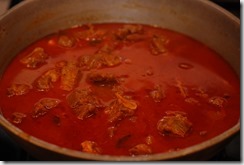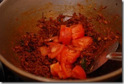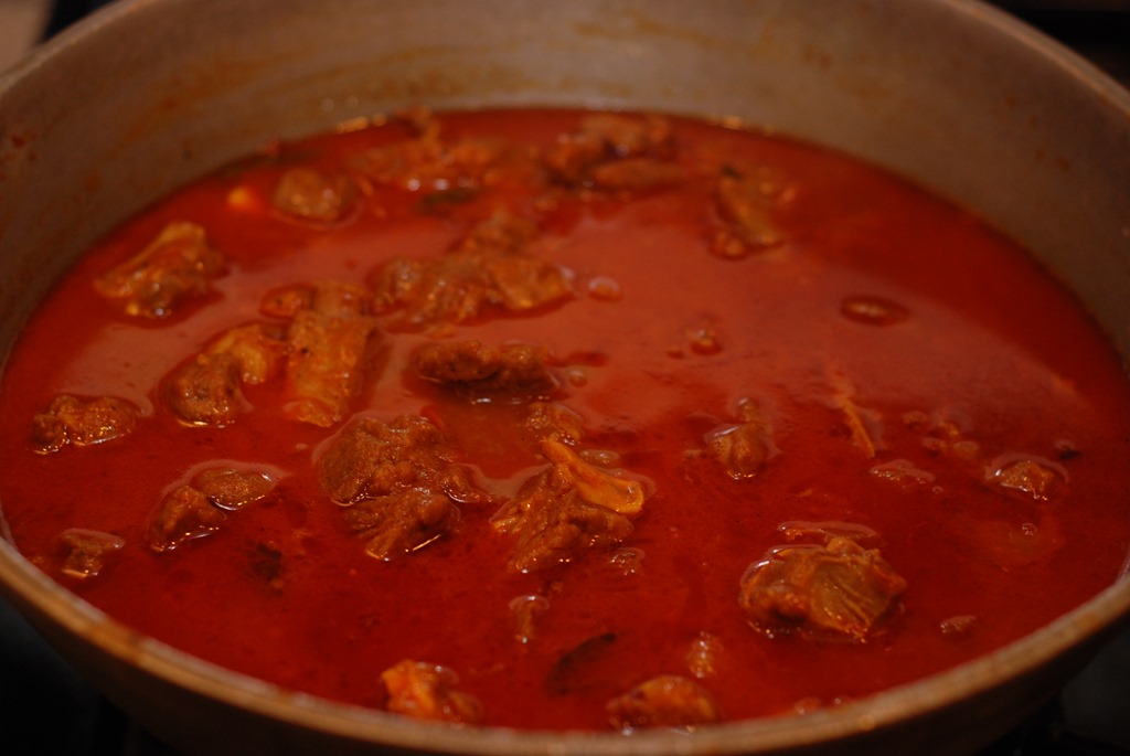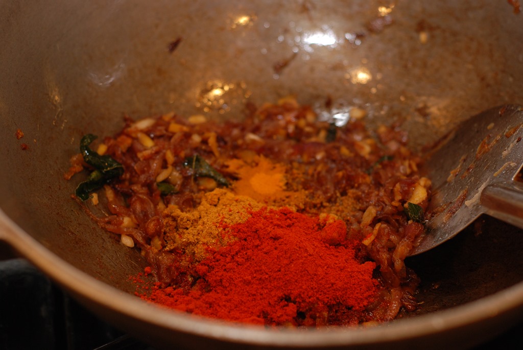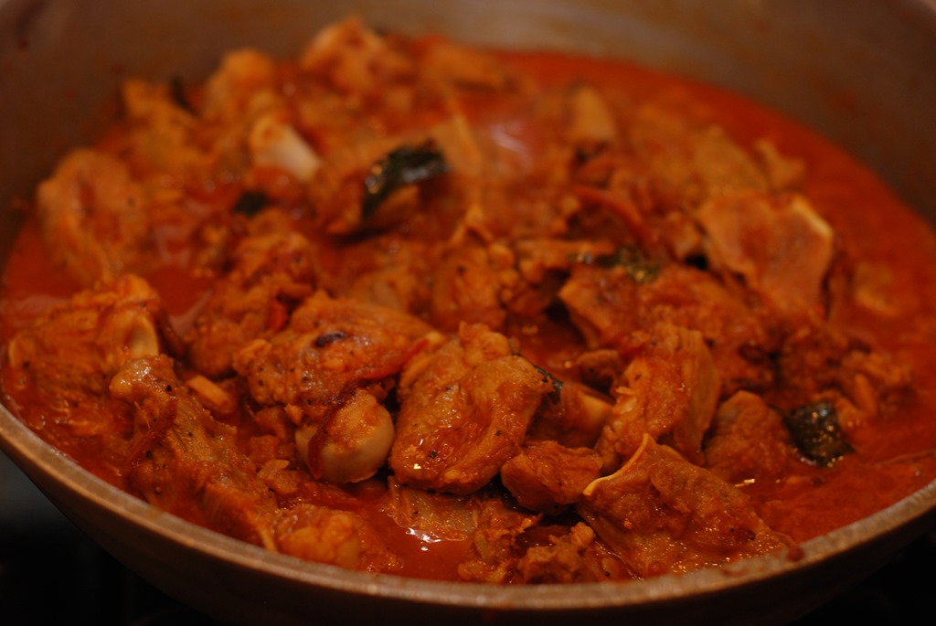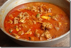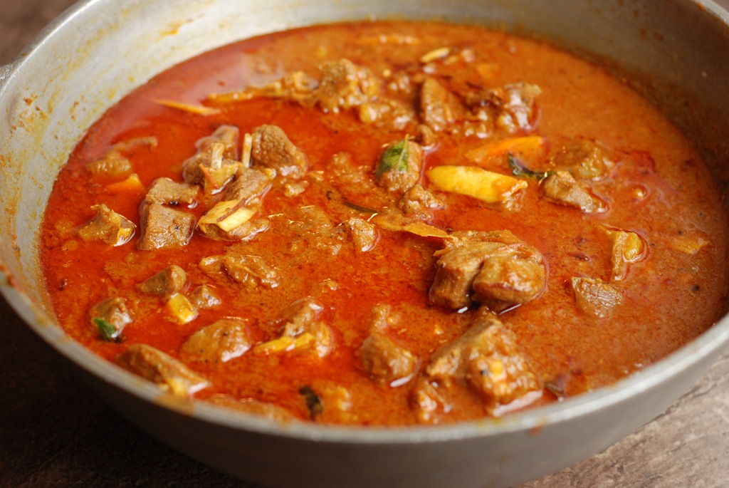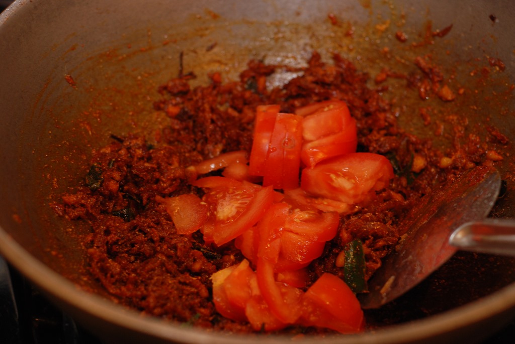 1. Heat 3 – 4 tbsp coconut oil in a heavy-bottomed vessel over medium-high flame. Add sliced onion and little salt. Saute until onion starts to change color. Add ginger and garlic. Continue to saute until golden. Bring down the heat to low. Add turmeric powder, chilly powder and coriander powder. Cook until their raw smell disappears. Add sliced tomato, salt and cook until oil separates. Add garam masala powder and mix well. Next add mutton pieces and mix well. Cook for 4 – 5 minutes. Add 2 cups of hot water and mix well. Bring to a boil. Cook covered for about 45 minutes (depends on the mutton you use) over medium-low heat, stirring occasionally, until the mutton is almost cooked. Add the roasted coconut paste. Mix well and cook covered for 5 – 8 minutes over low- medium heat. If the gravy is very thick, add 1/2 cup boiling water and cook covered for a few more minutes. Add a pinch of garam masala powder, few curry leaves and taste-check for salt. Switch off.