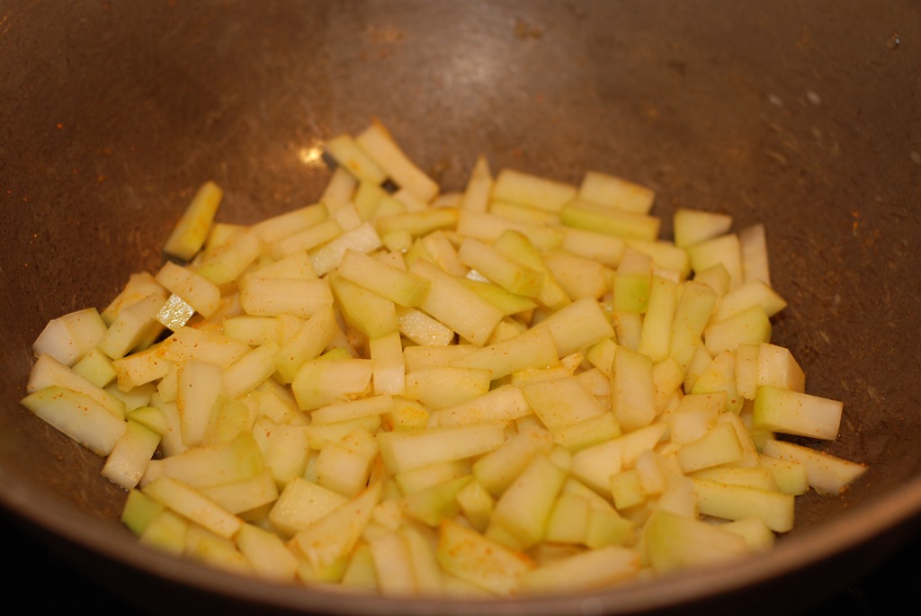 1. Cover and cook ingredients numbered 1 in a cheena chatti / kadai over medium-low heat for about 8 – 12 minutes until papaya is cooked and water is mostly evaporated. Switch off.