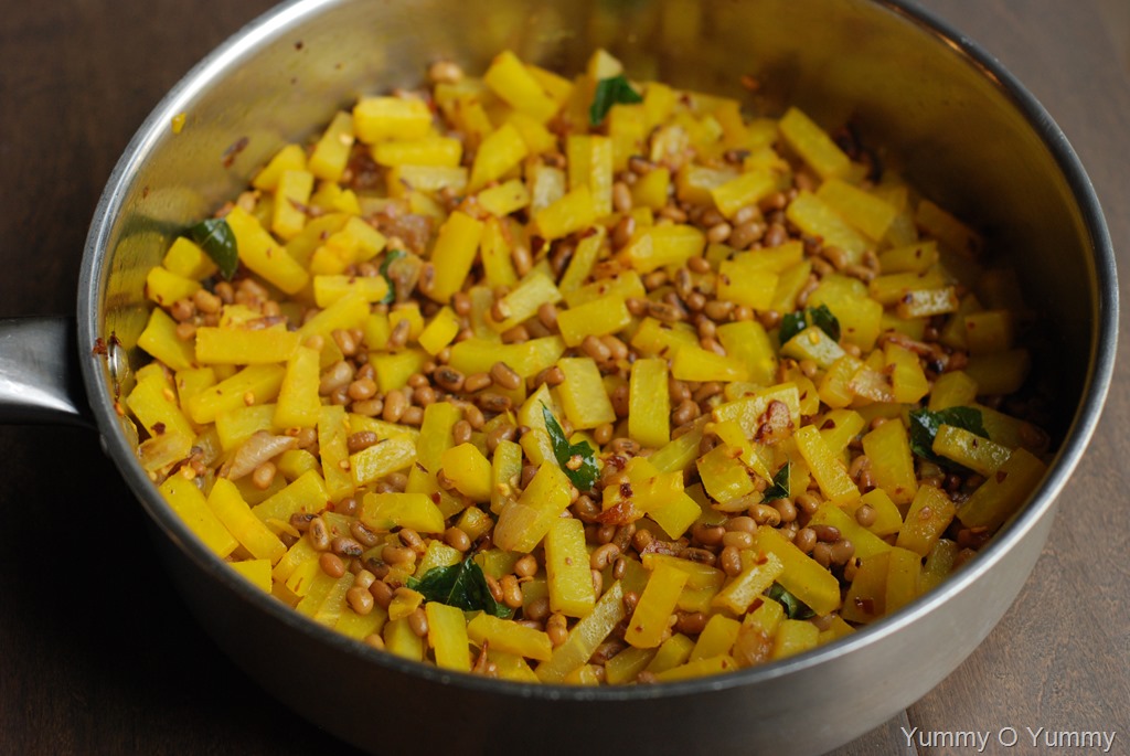 2. Heat coconut oil in another pan over medium-high heat. Add crushed garlic, shallots, curry leaves and a pinch of salt. Saute until light golden. Add chilly powder and crushed chilly flakes. Mix well. Add cooked papaya and vanpayar. Mix well. Cook for a few minutes. Switch off. Serve with rice and other side-dishes.