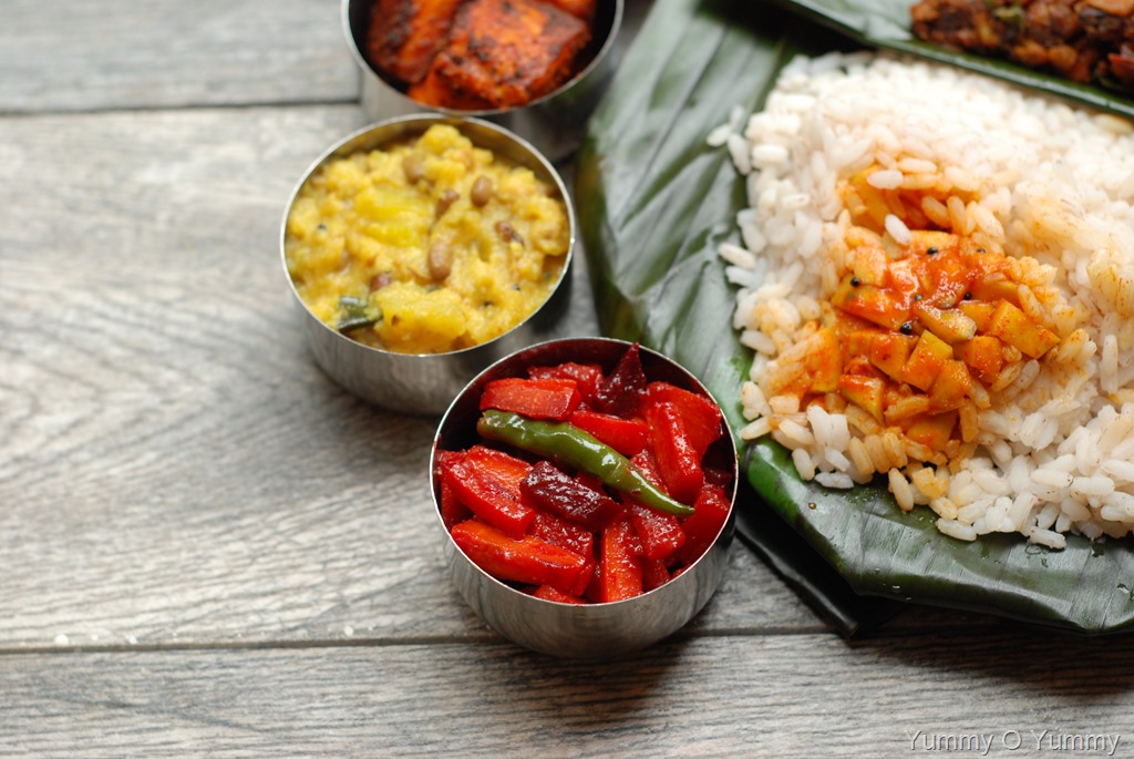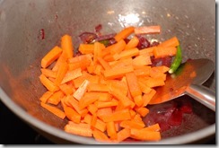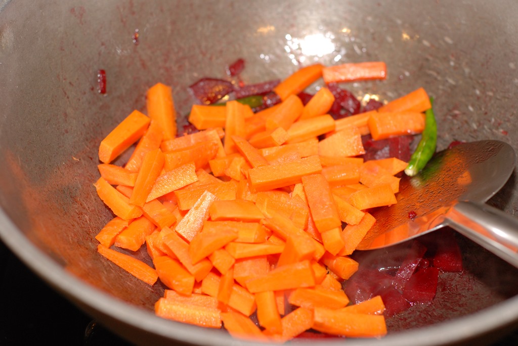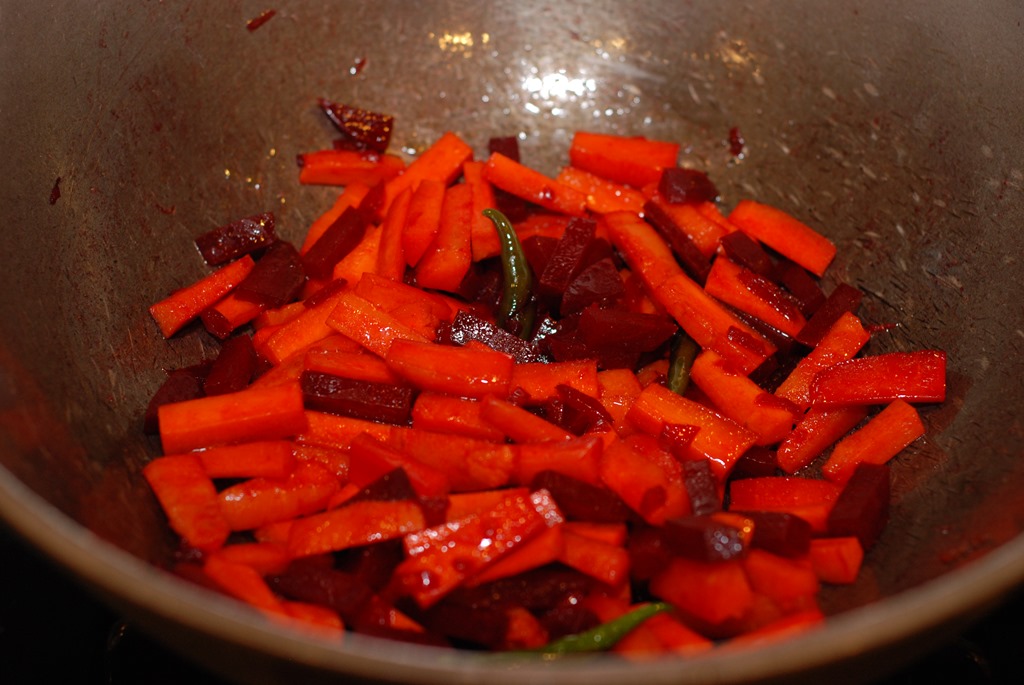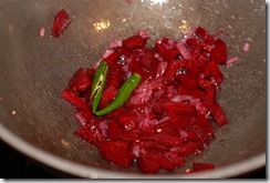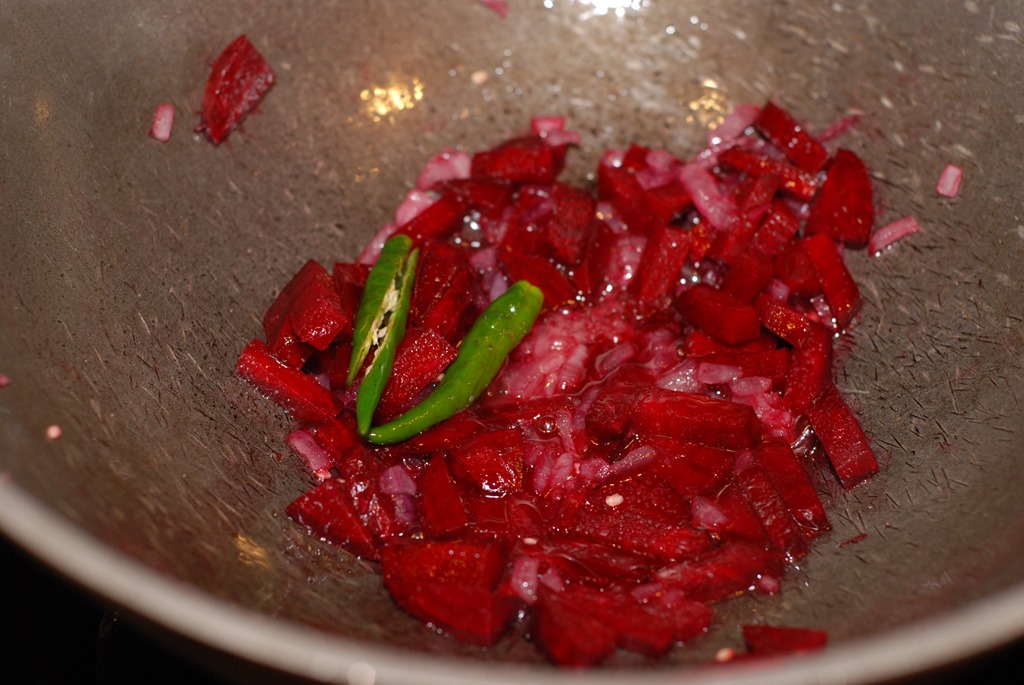 Heat oil in a kadai over medium heat. Add onion, green chilies and cook for 1 – 2 minutes. Add beetroot pieces, salt and mix well. Add 1/4 cup water. Cover and cook for 4 – 5 minutes until beetroot is half done. Add a pinch of turmeric powder, carrot and mix well. Cover and cook for a few minutes. Open the lid and cook for a few more minutes until both veggies are soft and done. Serve with rice and other side-dishes.