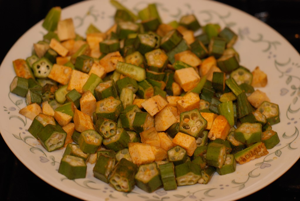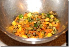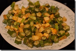 Okra / vendakka – 10 – 12 small or 1/2 – 3/4 cup, cut into medium thick rounds