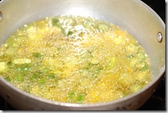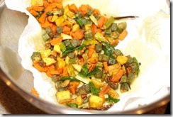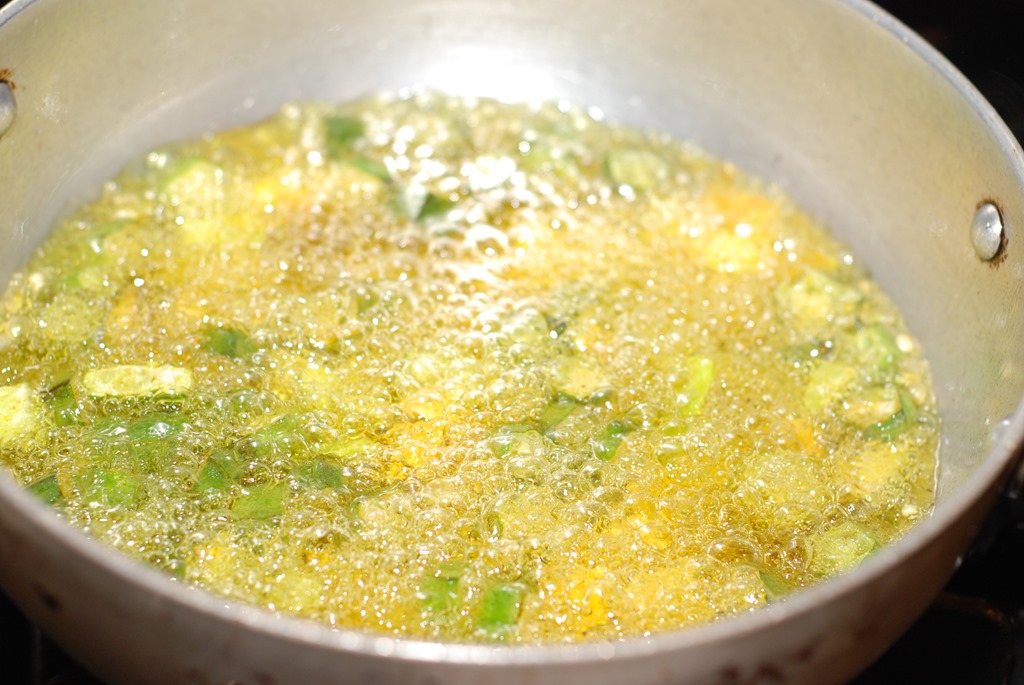 2. Heat oil in a kdai over medium high heat and fry the vegetables until slightly crisp, takes about 10 – 15 minutes. Few minutes before the veggies are ready to be removed, add a few slit green chilies and curry leaves. Fry for a few more minutes. Do not over fry. Using a slotted spoon, transfer the fried vegetables to a bowl lined with paper towel. Remove the paper towel and add a pinch of turmeric powder, chilly powder and salt,while still hot. Add salt, only if required. Toss well. It tastes superb with hot rice.