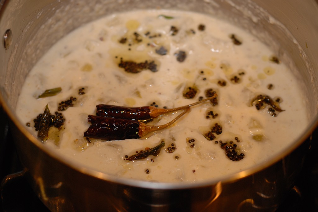 4. Heat oil in a small pan. Splutter mustard seeds and fry curry leaves and dried red chilly. Switch off. Pour this over the curry. Keep covered for 10 minutes. Mix well. Serve with rice.