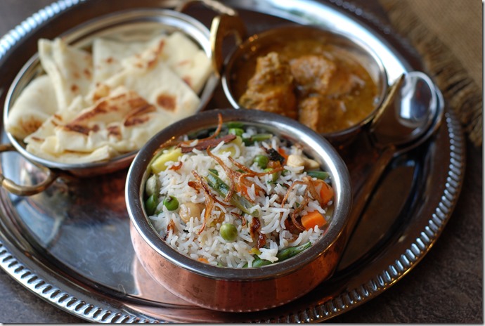 3. Spread 1 tbsp ghee in the same vessel. Sprinkle fried onion, cashews, raisins, mint and cilantro. Top with 1/3rd of the hot cooked rice. Sprinkle fried onion, cashews etc and little ghee and few drops of kewra water. Repeat until all the rice is used up. Sprinkle the items for garnish. Cover with an aluminium foil. Cook on the lowest heat setting for 2 – 3 minutes. Switch off. Open after 10 minutes. Mix gently. Serve with raita and any side-dish of your choice.