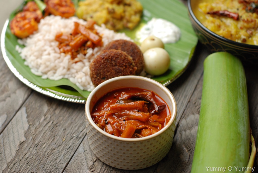 2. Heat coconut oil in a kadai over medium heat. Splutter mustard seeds and fry dried red chilies and curry leaves. Add shallots, little salt and cook until shallots starts to change color. Bring down the heat to low. Add turmeric powder, chilly powder, coriander powder and hing. Cook for a minute or two until their raw smell leaves. Squeeze taro stem pieces well and add to the kadai. Mix well. Cook for 5 – 6 minutes. Add tamarind juice, around 3/4 cup hot water, a pinch of jaggery or sugar, 1/8 tsp salt and mix well. Taste-check for salt. Cook covered for 8 – 10 minutes, stirring occasionally, until thick. Add salt, to taste. Finally add a tsp of coconut oil, few curry leaves and switch off. Serve with plain rice.
