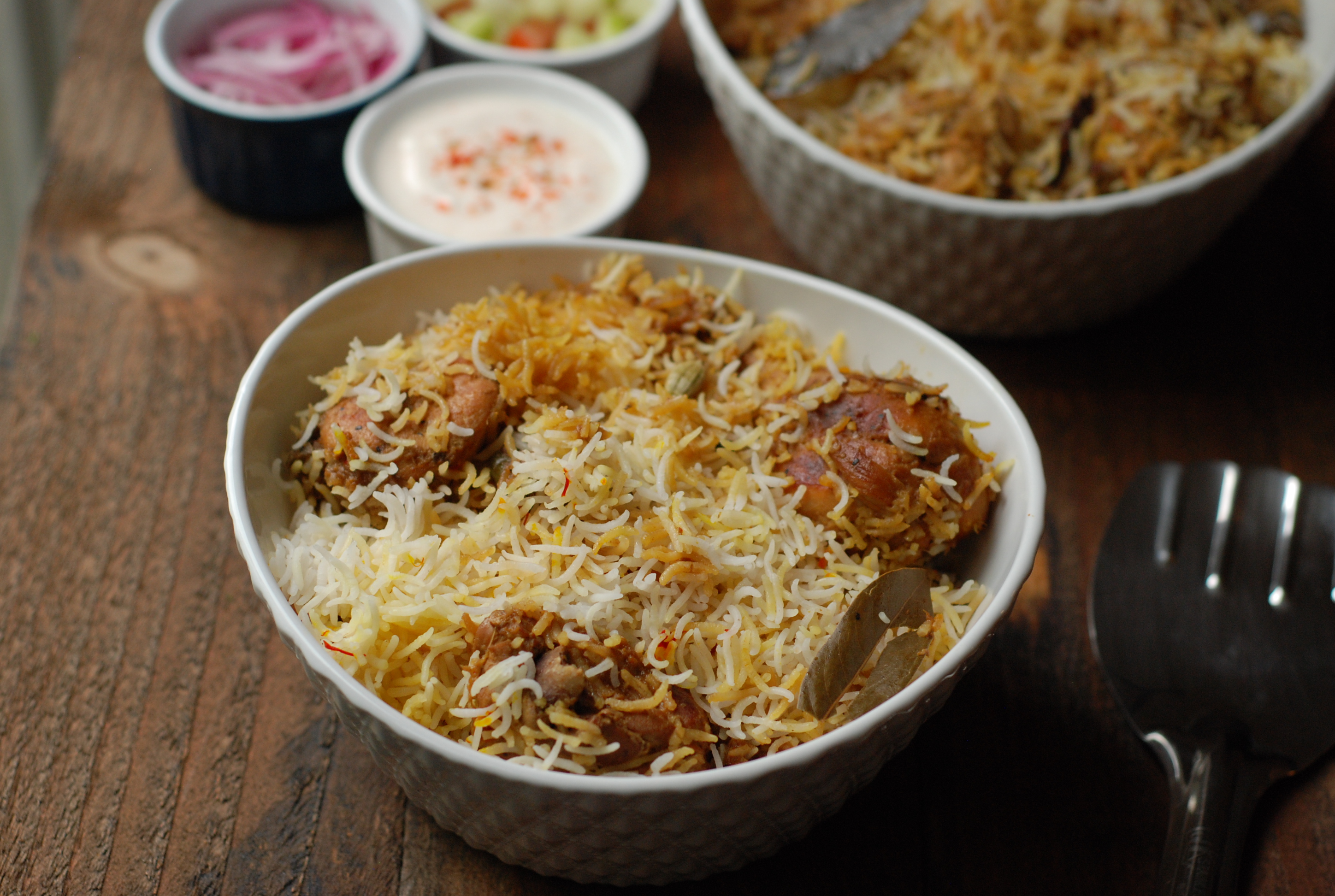 ) . Cook for 3 minutes. Bring down the heat to the lowest flame. Place the biriyani pot and cook for 7 -8 minutes. Switch off. Let it rest unopened for another 10 – 15 minutes in the biriyani pot. Yummy chicken biriyani is ready to enjoy! Serve hot with raita, kachumber salad/ pickle / pappad etc.