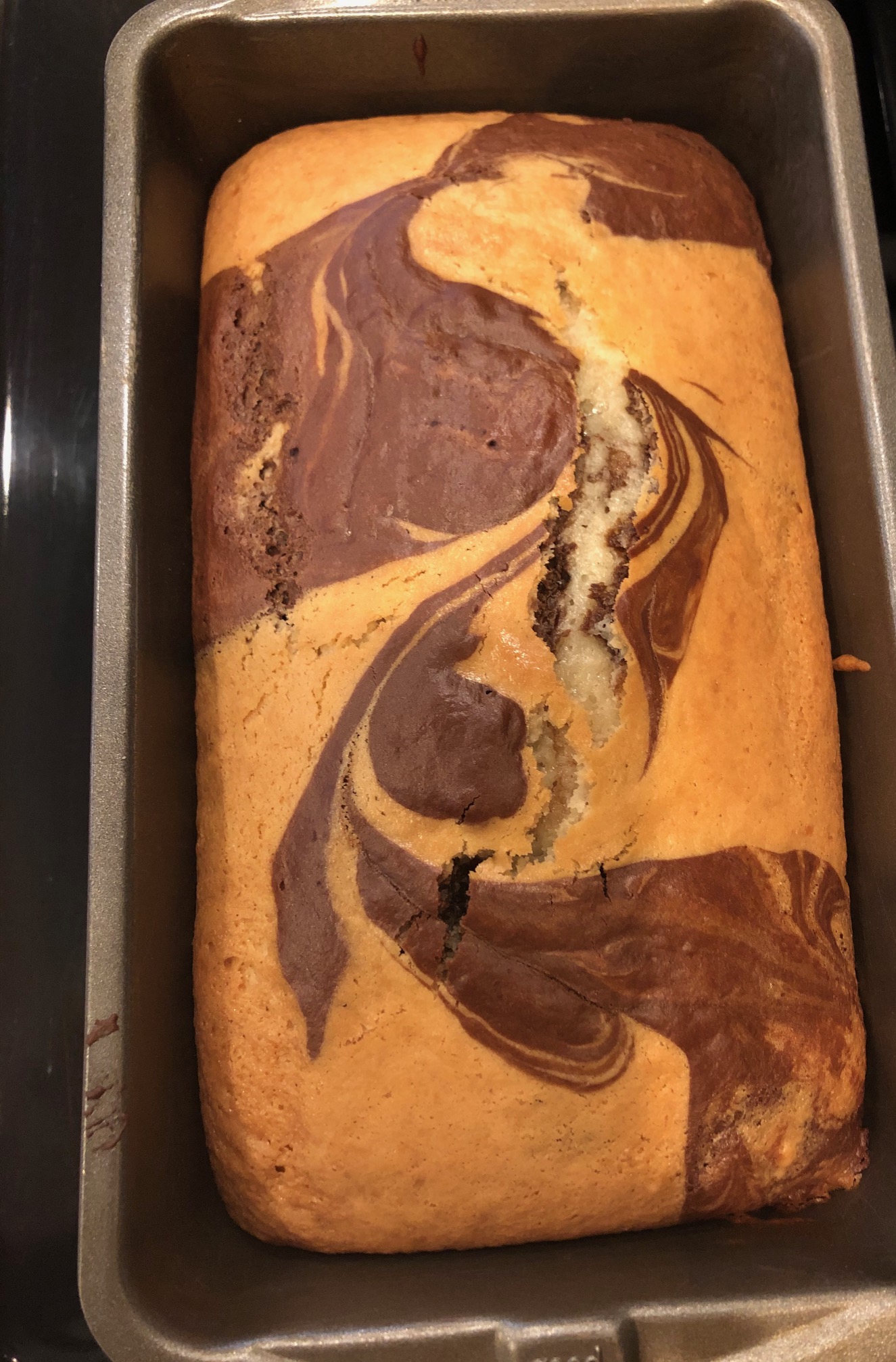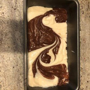 Alternately drop spoonful’s of the chocolate and plain batter into the prepared loaf pan. Using a knife, cut deep into the batter and make a few zig zag patterns (not more than 4 – 5 times). Bake for about 45 – 50 minutes or until a toothpick/knife inserted near the center comes out clean. Transfer the cake to a cooling rack. Let stand for 15 minutes. Run a blunt knife through the edges and unmold. Cool to room temperature and cut into slices. Enjoy!